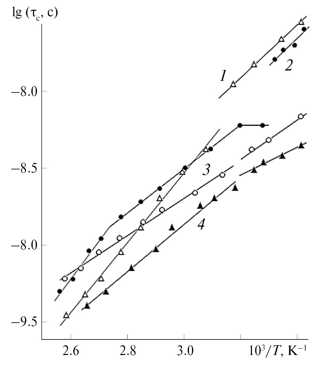 Рис. 3. Температурные зависимости времени корреляции вращательной подвижности радикала ТЕМПО в СКФ-26 (1), СКФ-32 (2), В-60 (3) и В-20 (4).