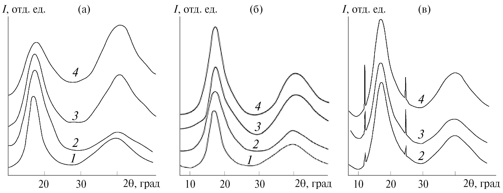 Рис. 1. Дифрактограммы ТСПЛ (1) после термообработки при 75 (а), 120 (б) и 170°С (в) в течение 20 (2), 45 (3) и 90 мин (4) в свободном состоянии.