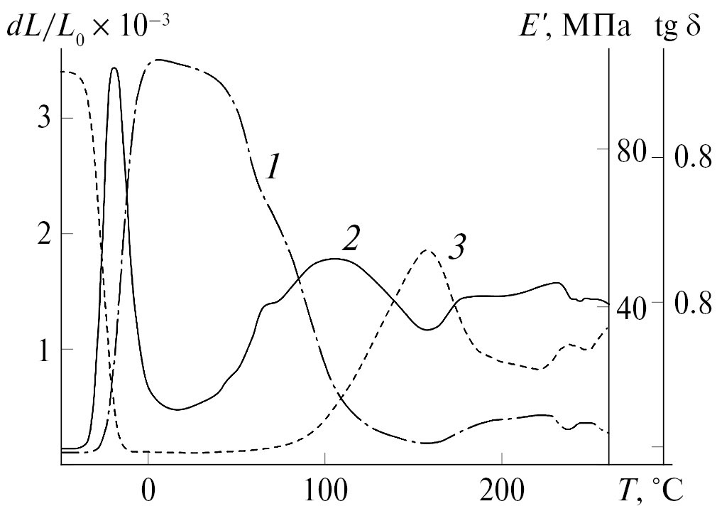 Рис. 2. Температурные зависимости коэффициента термического расширения (1), тангенса механических потерь (2) и модуля накопления (3) ТСПЛ.
