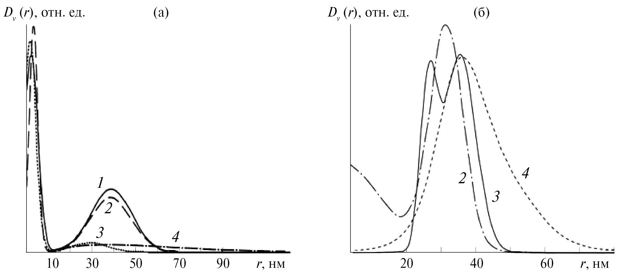 Рис. 3. Кривые распределения нанообразований ТСПЛ по размеру (1) после термообработки при 120 (а) и 170°С (б) в течение 20 (2), 45 (3) и 90 мин (4) в свободном состоянии.