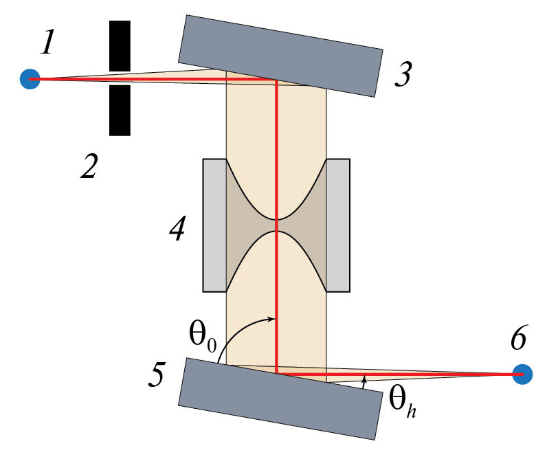 Рис. 1. Схема эксперимента: 1 – точечный источник, 2 – щель, ограничивающая пучок, 3 – первый кристалл, расширяющий пучок, 4 – линза, фокусирующая пучок, 5 – второй кристалл, сжимающий пучок, 6 – фокус, т. е. место, где пучок становится вторичным источником.