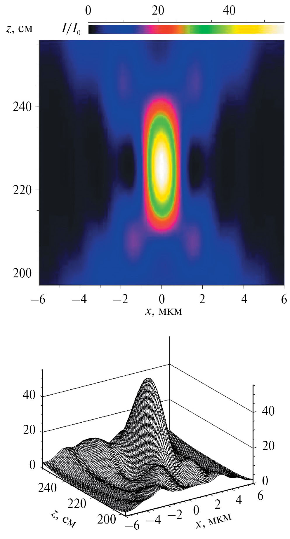 Верхняя часть рис. 2 показывает распределение интенсивности цветом с низкой точностью, зато точно представлены значения координат x и z. На нижней части рисунка распределение интенсивности показано в аксонометрической проекции поверхности в трехмерном пространстве. Хорошо видим, как меняется интенсивность, но все изменения искажены проектированием. На рис. 2 видно, что распределение интенсивности не является чисто гауссовским, а имеет сложные хвосты с дополнительными низкими максимумами. Главный пик почти соответствует стандартной форме, аналогичной фокусировке преломляющей линзой с конечной апертурой и без поглощения. Видно, что РДЛ фокусирует излучение, но в сравнении с параметрами пучка в фокусе, которые имеют место в случае СПЛ, имеющей 400 элементов, эффект более чем скромный.