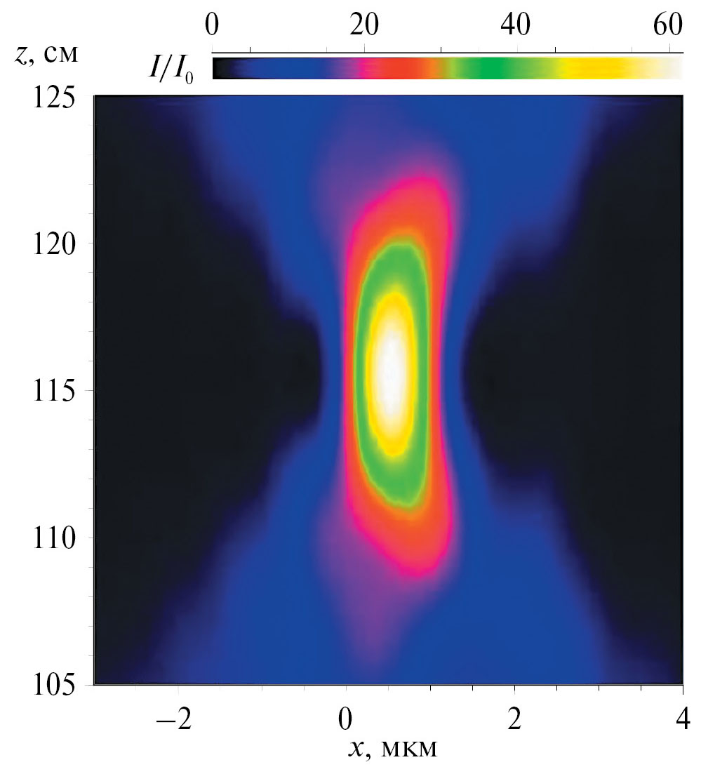 На рис. 2 представлены результаты расчета распределения интенсивности рентгеновского излучения в пустом пространстве после фокусировки с помощью РДЛ, описанной выше и рассмотренной в [5]. Результаты получены для следующих значений параметров: линза из бериллия с R = 1 мм, A = 2 мм, кристаллы из кремния, асимметричное отражение 220 с факторами асимметрии bk, равными 1/b для первого кристалла и b = 20 для второго. РДЛ фокусирует монохроматическое излучение точечного источника с энергией фотонов E = 17.48 кэВ. Дифракционные параметры для кристаллов вычисляли по онлайн-программе [15]. Фокусное расстояние такой линзы для плоской волны и с учетом сокращения при отражении вторым кристаллом примерно равно Fs = R/(2db2) = 1.12 м. Реальное расстояние z1 от РДЛ до фокуса зависит от расстояния z0 от источника до РДЛ. Все три расстояния удовлетворяют формуле линзы z0–1 + + z1–1 = Fs–1.