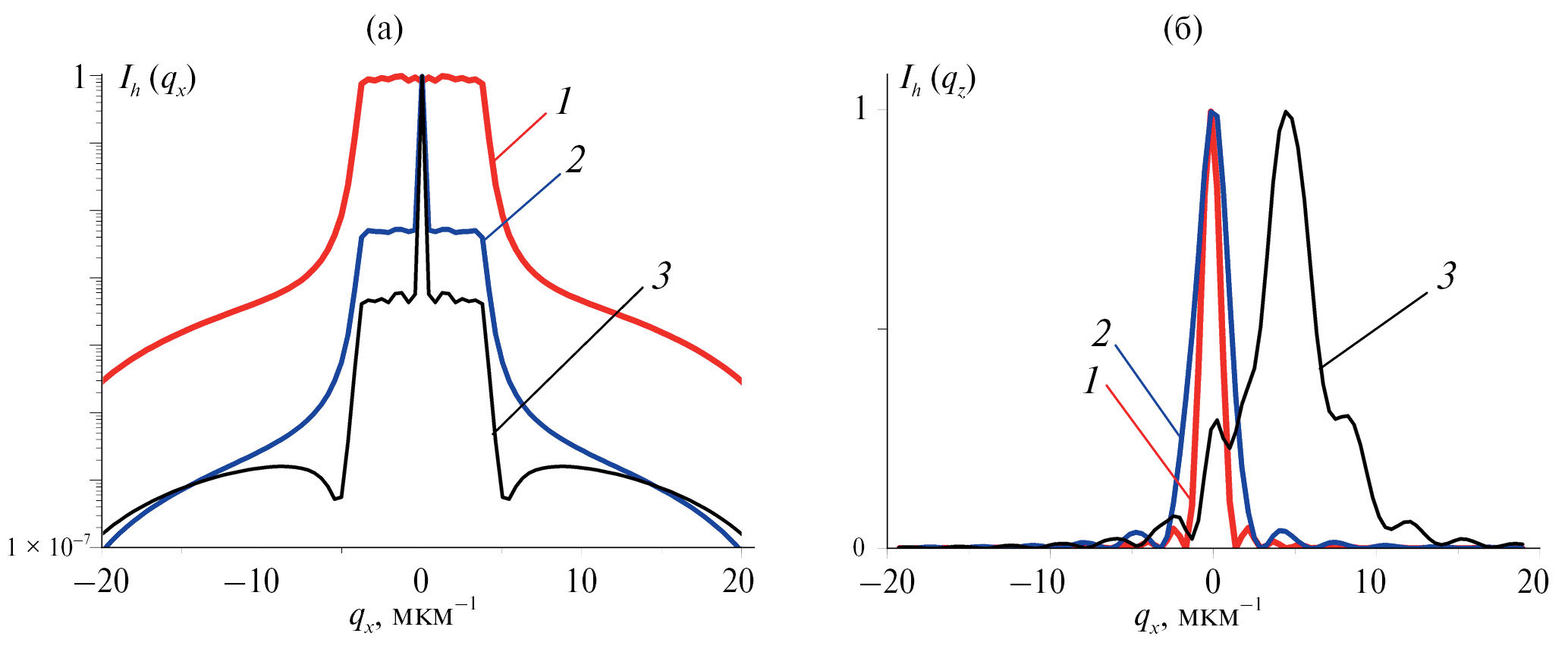 Рис. 5. Латеральные qx-сечения (а) и вертикальные qz-сечения (б) карт RSM от первой (1), второй (2) и третьей (3) моделей чипов МЭМС.