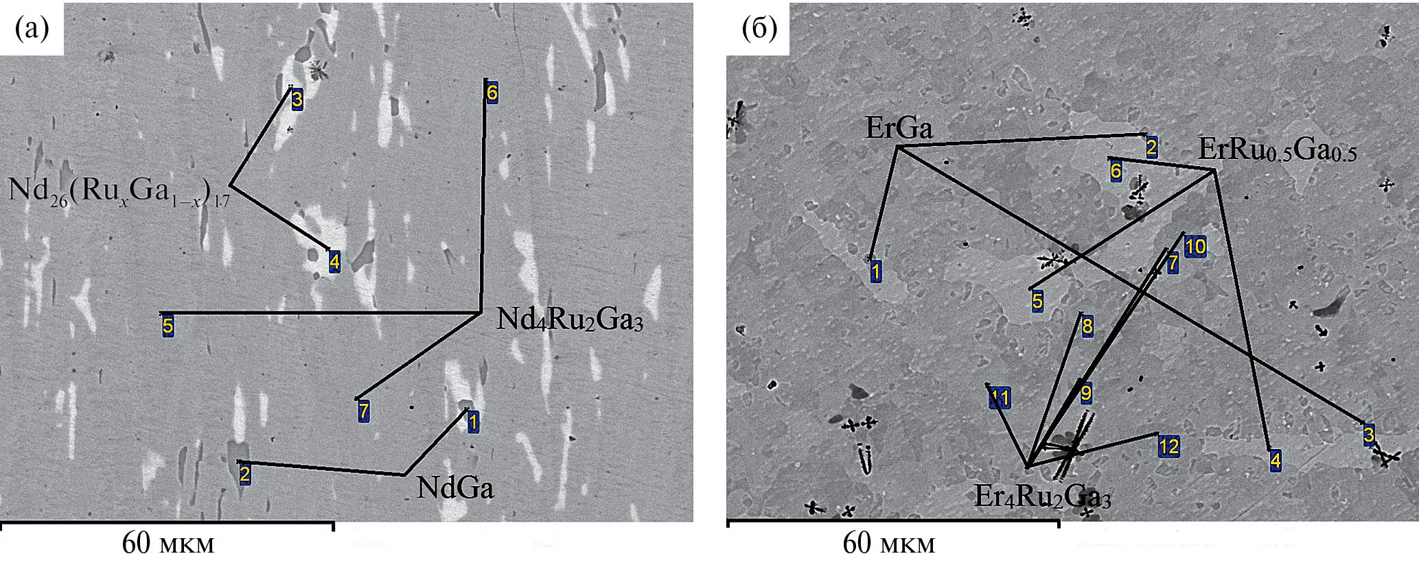 Рис. 2. Микроструктура отожженных образцов Nd4Ru2Ga3 (а) и Er4Ru2Ga3 (б).
