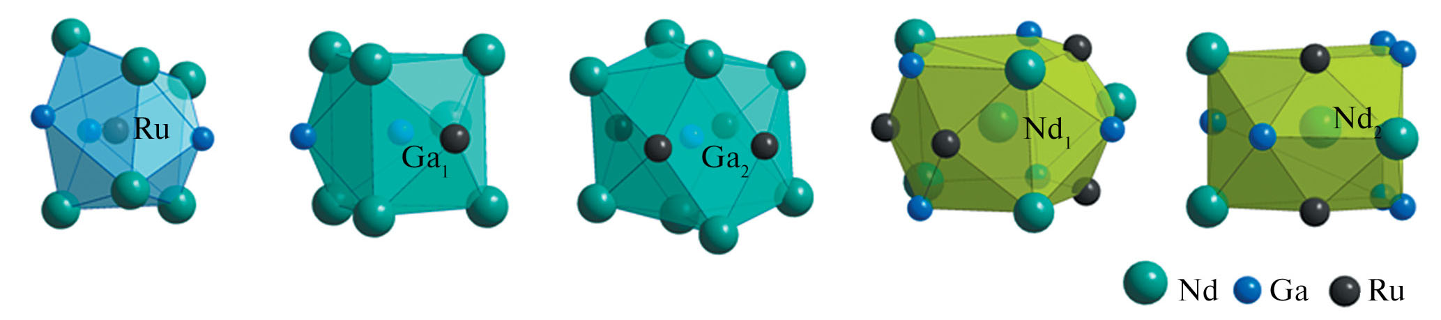 В кристаллической структуре Nd4Ru2Ga3 пять кристаллографически независимых атомов в позициях 4с: два атома неодима, один атом рутения и два атома галлия, причем атом Ga2 смещен из позиции 2b, поэтому заселенность позиции 4с равна 0.5. Ближайшее окружение атома рутения состоит из шести атомов неодима и трех атомов галлия, которые образуют трехшапочную тригональную призму (КЧ = 9) (КЧ – координационное число) (рис. 3). Окружением атома Ga1 является семивершинник из атомов неодима с двумя дополнительными атомами галлия и рутения (КЧ = 9), окружением атома Ga2 – сильно искаженная тетрагональная призма из атомов неодима и четырех атомов рутения над боковыми гранями (КЧ = 12). Атом Nd1 находится в центре пентагональной призмы, образованной четырьмя атомами неодима, четырьмя атомами галлия и двумя атомами рутения. Четыре из пяти боковых прямоугольных граней центрированы двумя атомами рутения, одним атомом галлия и одним атомом неодима (КЧ = 14). Атом Nd2 находится в центре тетрагональной призмы из четырех атомов галлия, двух атомов рутения и двух атомов неодима. Боковые грани центрируют два атома галлия и один атом неодима (КЧ = 11).
