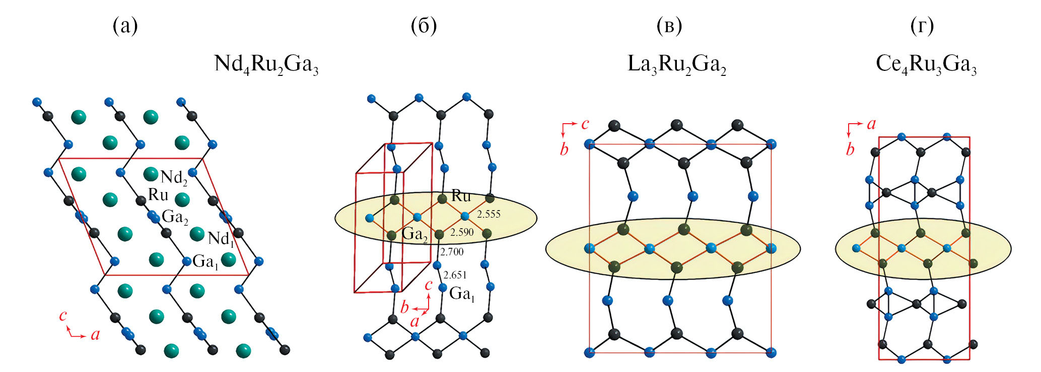 В целом структуру Nd4Ru2Ga3 можно представить как слоистую: гофрированные слои из атомов неодима чередуются со слоями из атомов рутения и галлия в направлении [001] (рис. 4а). Сетки из атомов рутения и галлия содержат фрагмент в виде цепочки из ромбов (рис. 4б), образованных атомами рутения и галлия. Аналогичный фрагмент наблюдается в других структурах с рутением и галлием: La3Ru2Ga2 (рис. 4в), Ce4Ru3Ga3 (рис. 4г). Все атомы, образующие ромбы в цепи, в Nd4Ru2Ga3 лежат в одной плоскости, а в структуре La3Ru2Ga2 и Ce4Ru3Ga3 ромбы развернуты друг относительно друга.