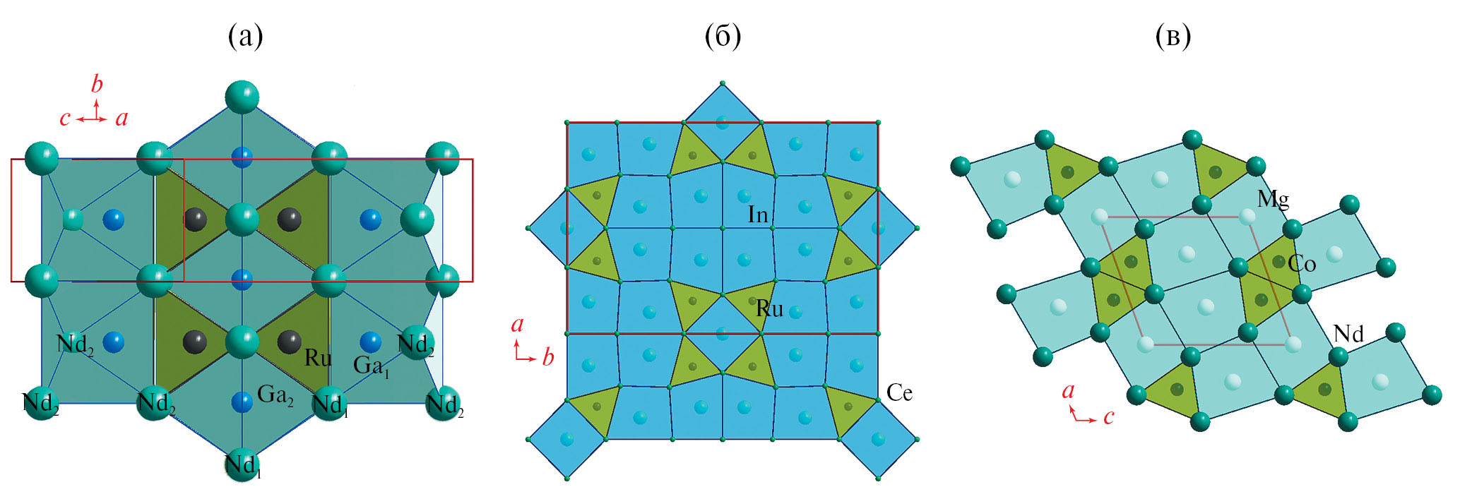 В структуре Nd4Ru2Ga3 только атом Ga2 располагается в искаженном восьмивершиннике типа CsCl, причем расстояния в полиэдре до атомов неодима более 3.161(9) Å, что больше суммы их атомных радиусов. Возможно, именно этот факт является причиной разупорядочения атома Ga2, поскольку пустота, образованная атомами неодима, слишком большая. Вокруг атома Ga1 атомы неодима образуют семивершинник, расстояния в котором меньше или равны сумме атомных радиусов атомов неодима и галлия. Форма полиэдра может быть описана как искаженный куб с одной вырожденной вершиной. В целом вся структура может быть представлена как совокупность фрагментов типа AlB2 и CsCl, только часть фрагментов CsCl – вырожденными полиэдрами. В отличие от структур с магнием и индием слои в структуре Nd4Ru2Ga3 не являются плоскими и направлены перпендикулярно оси a (рис. 4а). Наименьший параметр b в структуре Nd4Ru2Ga3 равен не высоте тригональной призмы RuNd6, а длине ребра одного из его треугольных оснований.