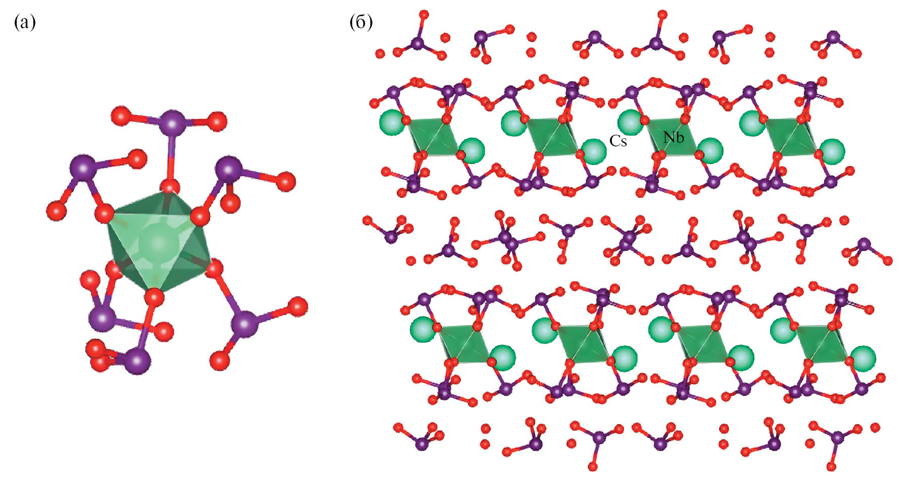 Структура (H3O)HCs2Nb(IO3)9 (пр. гр. P21) [4] достаточно близка по топологии к структуре упомянутого выше Cs3Ta(IO3)8: в ней изолированные блоки [Nb(IO3)6] с точечной группой симметрии 1 (рис. 5а) и катионы Cs расположены послойно на одном уровне и размножены псевдоцентрами инверсии, тогда как на другом уровне находятся две независимые изолированные IO3-группы, размещение одной из которых нарушает центросимметричность всей структуры (рис. 5б). Расположение NbO6-октаэдров (без учета IO3-групп) и атомов Cs подчиняется псевдотройной оси, что роднит структуру с тригональной Cs3Ta(IO3)8.