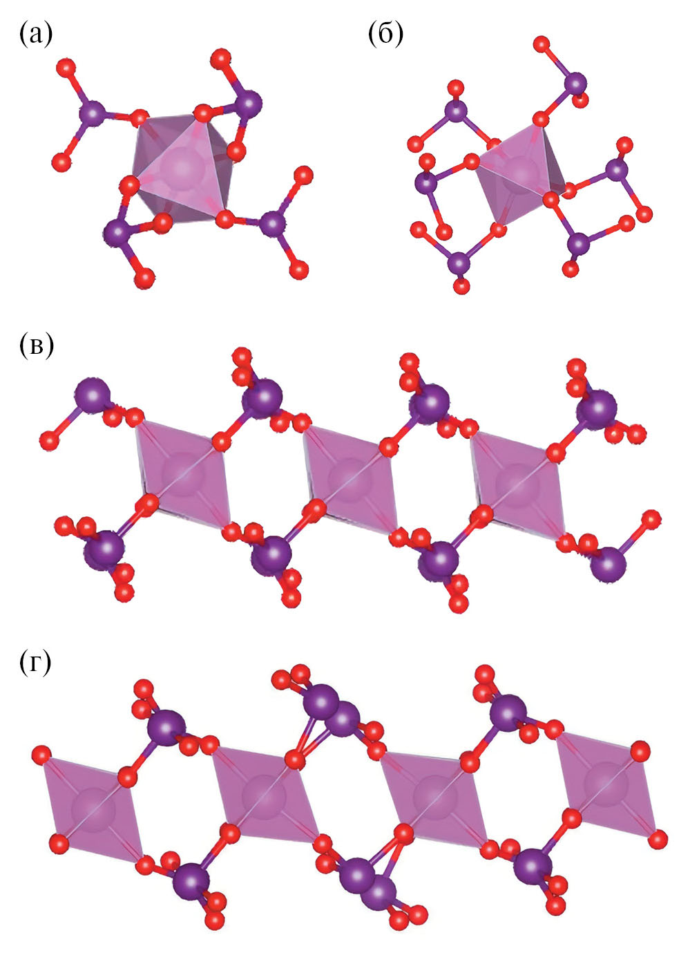 В структурах иодатов, принадлежащих семейству AIn(IO3)4 (A = Na, Ag), несмотря на общую пр. гр. P21/c, имеются различия в конфигурации и симметрии блоков: в структурах обеих модификаций NaIn(IO3)4 блоки [In(IO3)6] центросимметричны (рис. 8а), тогда как в структуре AgIn(IO3)4 центр инверсии в блоках отсутствует (рис. 8б). Во всех трех структурах блоки связаны общими иодатными группами в цепочки, слегка различающиеся конфигурацией (рис. 8в, 8г).