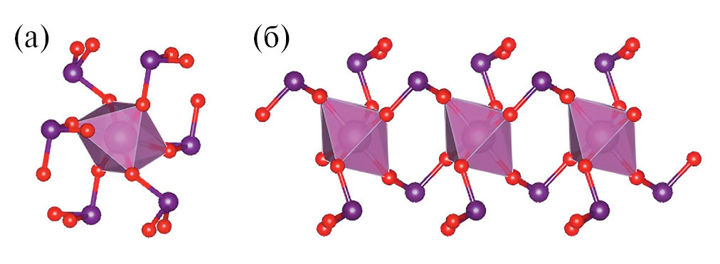 В кристаллической структуре α-LiIO3 и структурах семейства A2M(IO3)6 (A = Li, Na, H3O+; M = Ti, Sn, Pt) блоки [M(IO3)6] связаны общей гранью октаэдра и образуют одномерные стержни (рис. 6б, 6в), тогда как в структурах семейств M(IO3)3 (M = Al, Cr, Fe3+, In, Ga) и M(IO3)2 (M = Mg, Zn, Co, Ni, Cu2+, Mn2+) без щелочных катионов блоки формируют трехмерный каркас, объединяясь через общие группы IO3 (рис. 6г). Структура α-LiIO3 также представляет собой каркас, но из одномерных стержней, связанных общими группами IO3–, а не отдельных блоков.