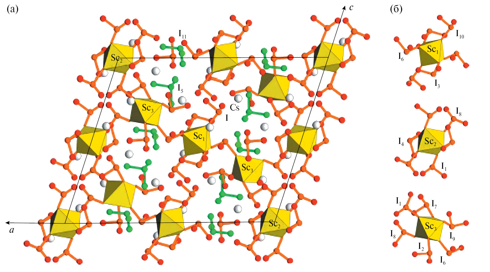 Рис. 12. Проекция на плоскость ас структуры Cs5[Sc2(IO3)9](IO3)2 с каркасом из блоков [Sc(IO3)6] (а); отдельные блоки [Sc(IO3)6] c точечной симметрией и 1 в структуре Cs5[Sc2(IO3)9](IO3)2 (б).
