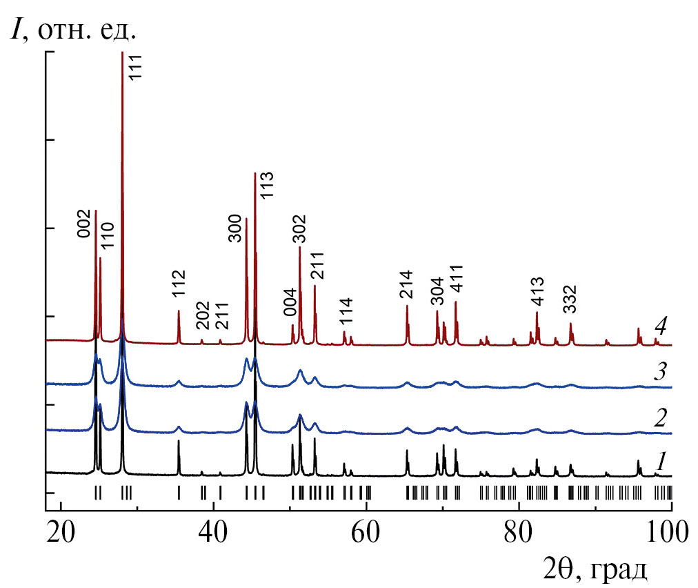 Рис. 2. Дифрактограммы твердого раствора Pr1–ySryF3–y: 1 – направленная кристаллизация расплава, 2 – метод МД, продолжительность τ = 1 ч, 3 – метод МД, τ = 4 ч, 4 – метод МД, τ = 4 ч и отжиг при T = 1273 K, τ = 2 ч. Показаны рассчитанные положения рефлексов Брэгга для пр. гр. P3c1 c параметрами a = 7.0802(1) и с = 7.2457(3) Å.