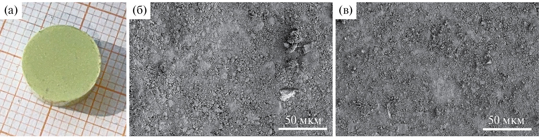 Рис. 4. Внешний вид поликристаллического образца (а) и СЭМ-изображение участков поверхности керамик, полученных из частиц Pr0.97Sr0.03F2.97 после τ = 1 (б) и = 4 ч (в) помола.