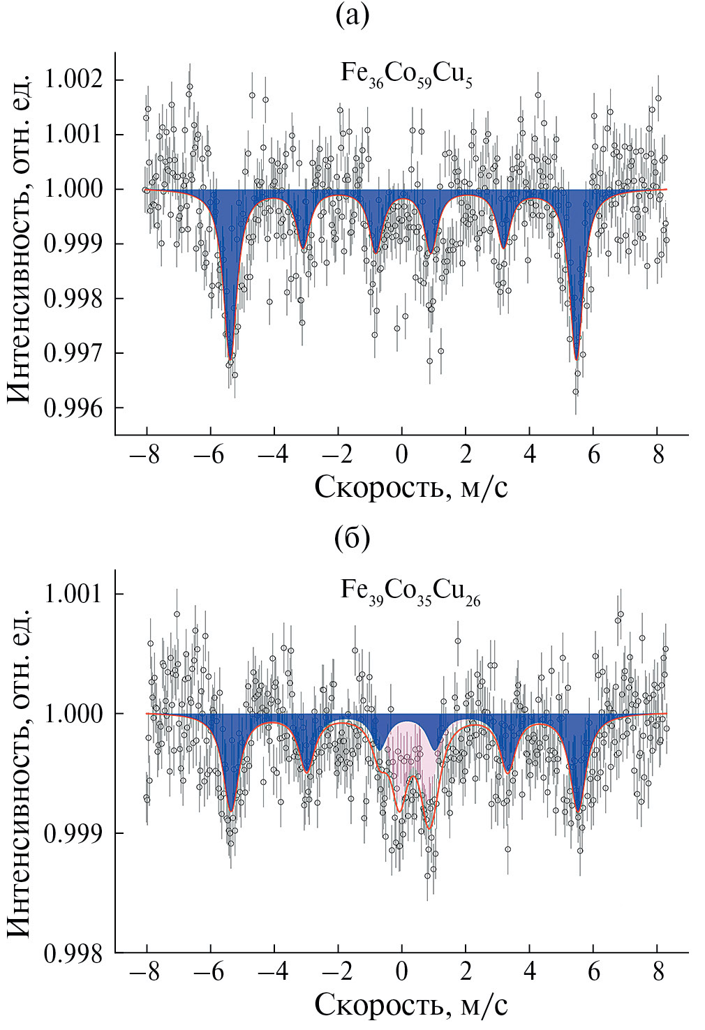 Рис. 5. Мессбауэровские спектры образцов НП: а – Fe36Co59Cu5, б – Fe39Ni35Cu26. Темным цветом обозначена ферромагнитная компонента, светлым – парамагнитная.