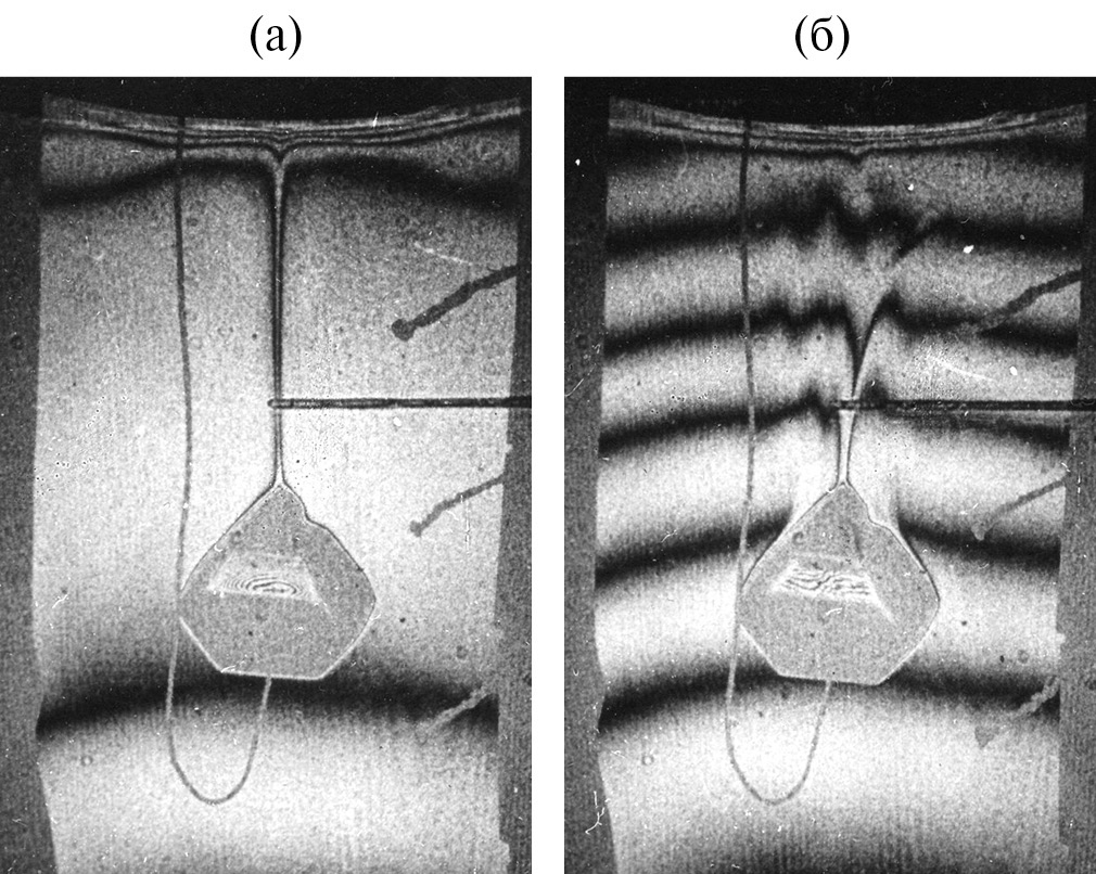 Рис. 2. Интерферограммы роста кристалла квасцов при пересыщении раствора 0.07 (а) и 0.12 (б). Ширина поля изображения – 2 см.
