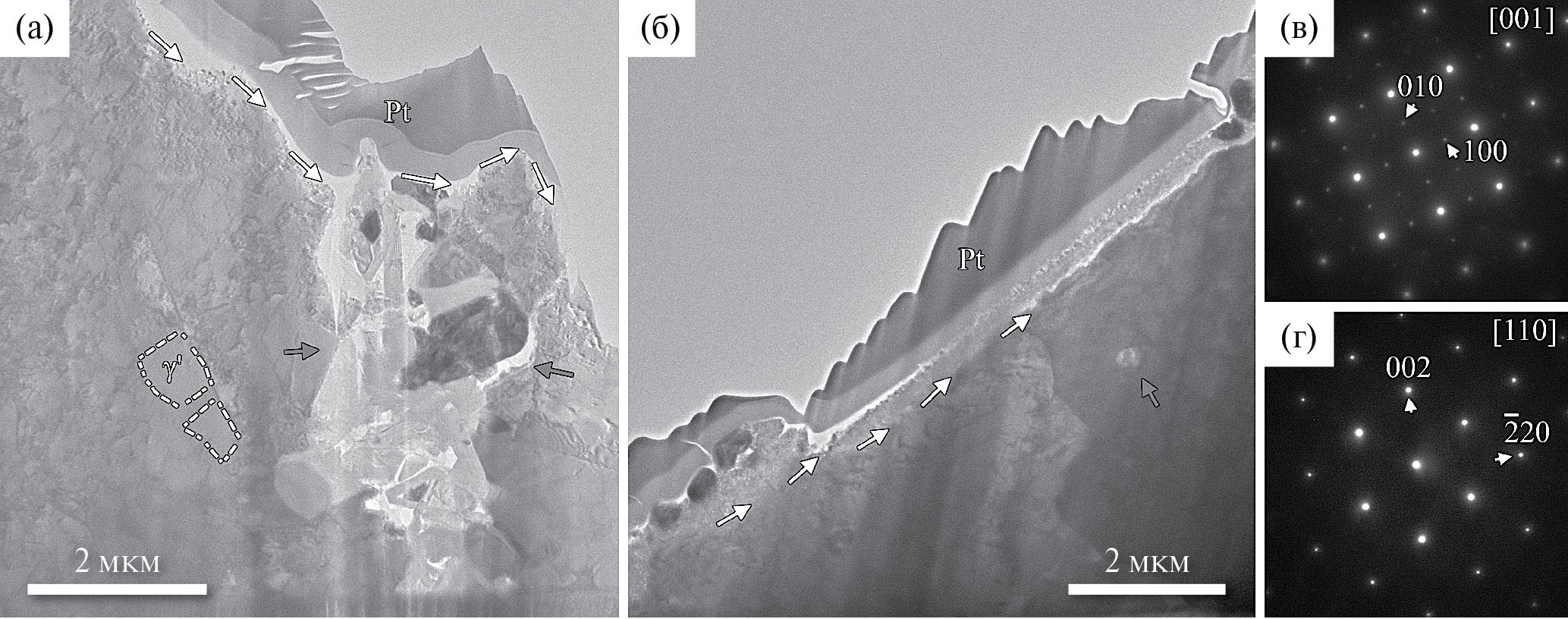 На рис. 1а, 1б представлены светлопольные ПЭМ-изображения ламелей, вырезанных перпендикулярно плоскостям усталостных трещин, по которым образец был разрушен на две части во время испытаний на малоцикловую усталость. Граница этой трещины обозначена белыми стрелками. Для защиты образца в процессе подготовки ламелей на их поверхность напыляли слой платины, который также наблюдается на изображениях (рис. 1а, 1б). Сплав представляет собой неупорядоченный твердый раствор γ-Ni (пр. гр. Fm3m), заполненный преципитатами, упорядоченными по типу L12 интерметаллидной γ´-фазы (Ni3Al, пр. гр. Pm3m), которые отмечены на рис. 1а пунктирными линиями. Электронограмма, показанная на рис. 1в, является комбинацией электронных дифракций γ- и γ´-фаз, наблюдаемых вдоль кристаллического направления [001]. Помимо γ´-преципитатов в матрице встречаются одиночные включения карбидов титана/ниобия (СTixNb1–x – Fm3m), один из которых отмечен серой стрелкой на рис. 1б. Электронограмма от такого карбида показана на рис. 1г. Кроме того, отмечено присутствие карбидов на основе вольфрама и гафния. Такие карбиды попадают в расплав на ранних этапах кристаллизации металла. Из-за высокой температуры плавления, которая варьируется в пределах от 3000 до 3500°С в зависимости от соотношения x [18], их кристаллическая структура и морфология не изменяются на протяжении всех этапов формирования сплава и его обработки.