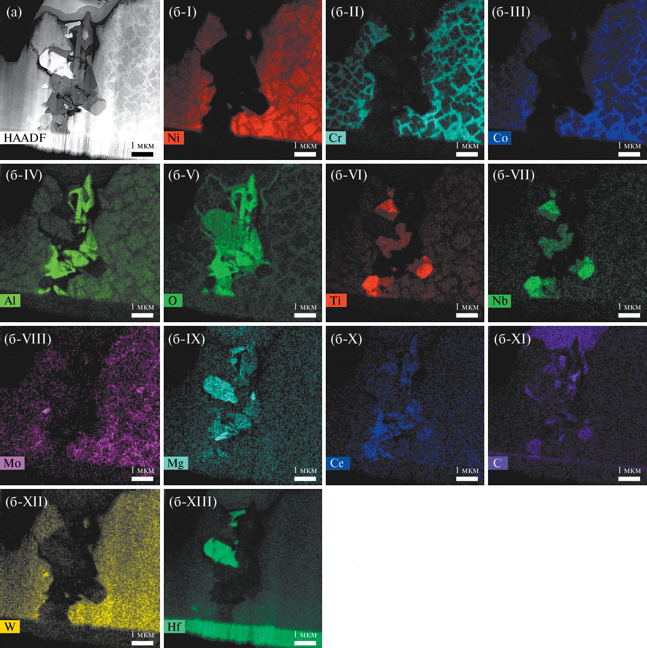 Карты распределения элементов, построенные методом ЭРМ вблизи дефекта, представлены на рис. 2. Карты позволяют выявить различия γ- и γ'-фаз: неупорядоченная фаза γ содержит меньше алюминия, но больше растворенных тугоплавких элементов – Cr, Co и Mo. Элементное картирование выявило высокое содержание кислорода в частицах дефекта, содержащих Hf, Al, Mg, а также частицы с повышенным содержанием Nb, Ti, Mo и других элементов, входящих в состав сплава.