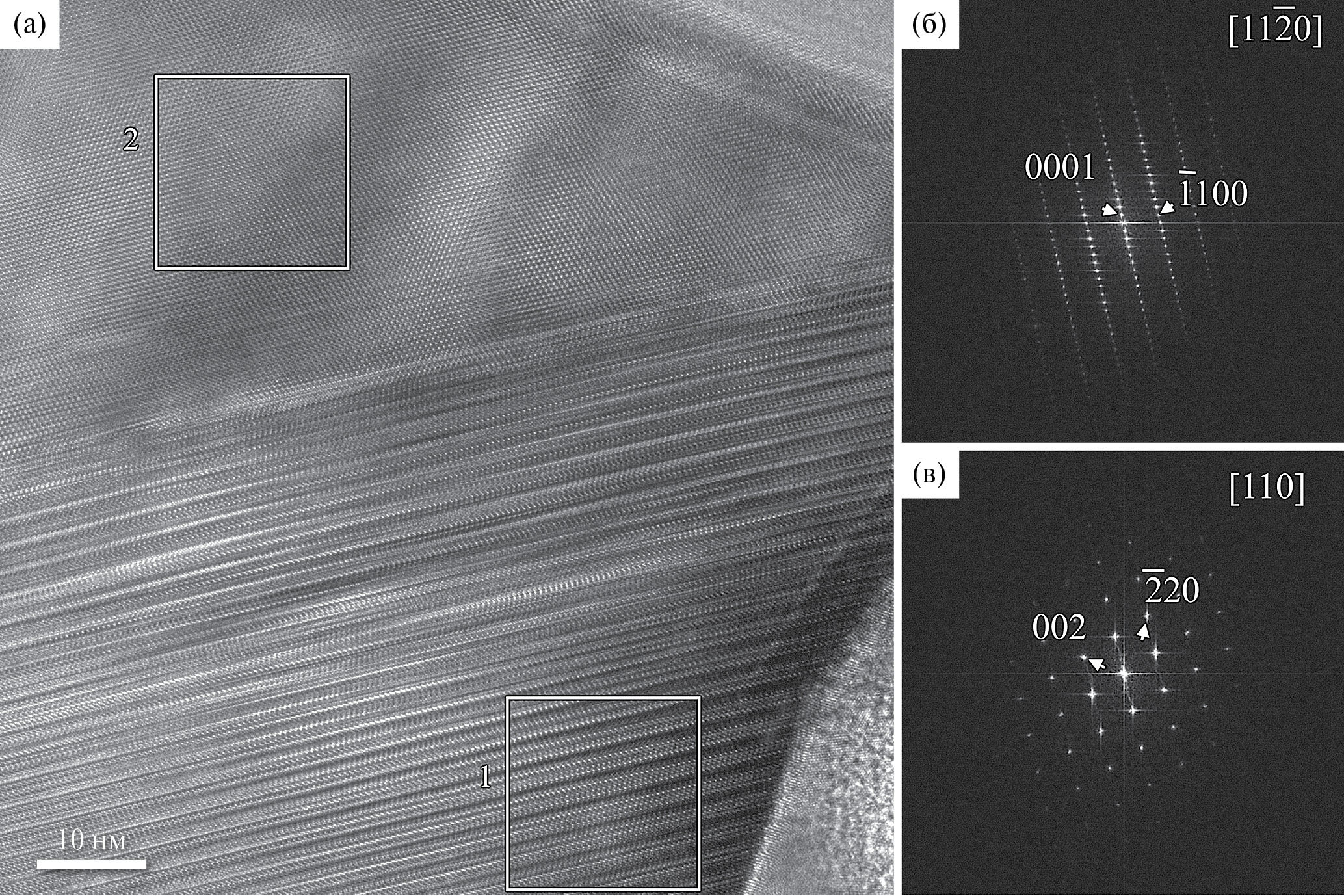 Рис. 5. ВР ПЭМ-изображения β-оксида алюминия (область 1) и шпинели (область 2) (а); соответствующие им спектры Фурье (б, в).