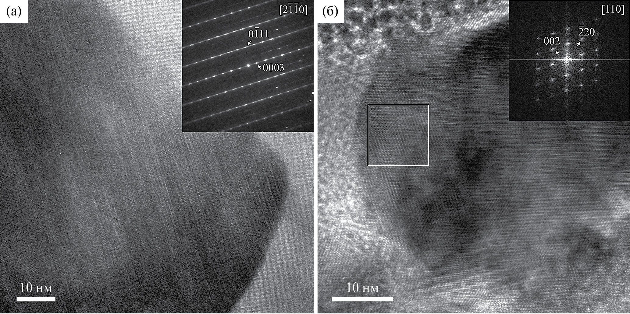 На рис. 6а представлено ВР ПЭМ-изображение интерметаллида Co7Mo6 (R3m), электронограмма которого приведена на вставке. Такое включение может рассматриваться как зародыш топологически плотноупакованной σ-фазы. Подобные частицы встречаются в дефектах в форме ограненных кристаллов. ВР ПЭМ-изображение частицы Co3O4 (Fd3m) и соответствующий спектр Фурье показаны на рис. 6б. Частицы оксида кобальта характеризуются эллипсоидальной морфологией.