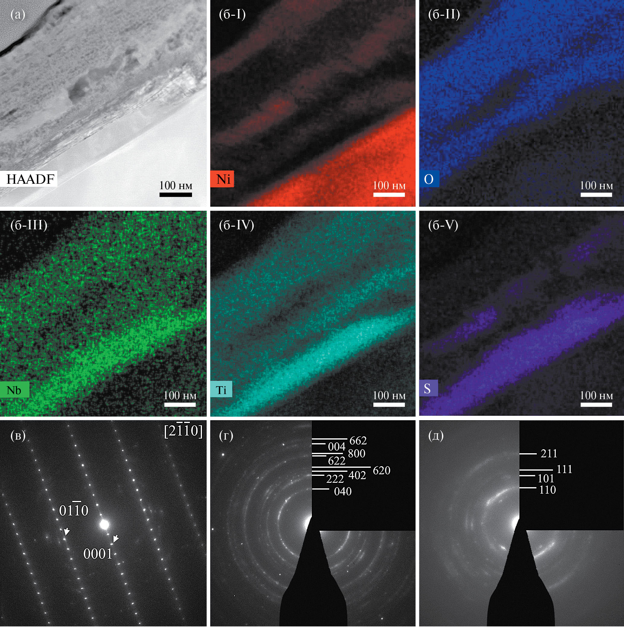 Согласно ЭРМ-картам распределения элементов, представленным на рис. 7б-I–7б-V, в дефектах в составе оксидов или сульфидов встречается Ti. Как оксиды, так и сульфиды характеризуются пластинчатой морфологией. Электронограмма, полученная от сульфида титана, полностью отвечает дифракции от S4Ti3 (пр. гр. P63/mmc), наблюдаемой вдоль кристаллического направления [2110] (рис. 7в). Оксид ниобия и оксид титана представлены в виде нанокристаллических конгломератов NbO2 (I41/a) и TiO2 (P42/mnm) (рис. 7г, 7д), образующих частицы в форме эллипсоидов или вытянутых пластин, параллельных изломам усталостных трещин.