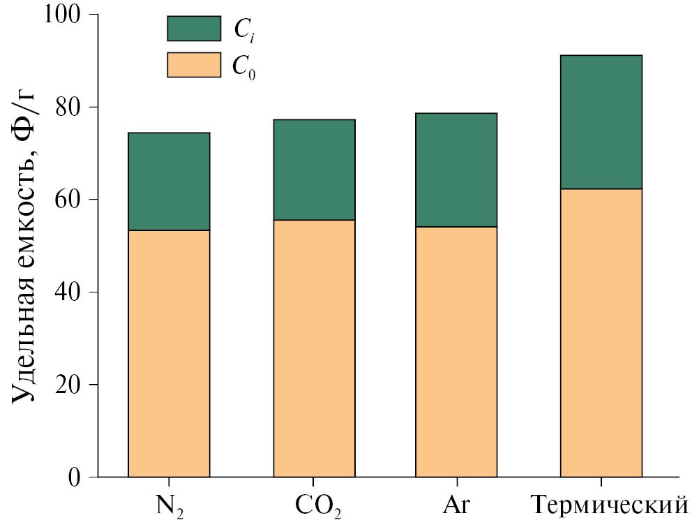 На рис. 10 представлены результаты исследования методом Тразатти электродов, полученных методом микроволновой карбонизации в различных средах, а также для сравнения полученных классическим термическим методом [6]. Наибольшую общую емкость (CT = Ci + Co) ~90 Ф/г показывают электроды, полученные традиционным термическим методом. В случае электродов, полученных микроволновым методом, это значение ниже и лежит в пределах от 70 до 80 Ф/г. Значение Co, ассоциирующееся с механизмом накопления заряда в двойном электрическом слое, для всех электродов лежит в диапазоне от 50 до 60 Ф/г. Однако в случае электродов, полученных микроволновым методом, на псевдоемкость приходится ~25% от общей емкости, а в случае материала, полученного термическим методом, ~33%.