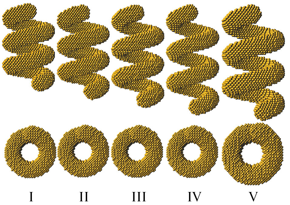 Хотя приведенные выше рассуждения характерны для спиралей, подобные рассуждения можно провести для любых частиц, обладающих следующим свойством: отрезки одной и той же длины, концы которых принадлежат объему частицы, лежат как внутри частицы, так и могут пересекать пустое пространство. В случае со спиралями это отрезки, лежащие внутри одного витка, и отрезки, соединяющие соседние витки. В зависимости от величины весов штрафных членов в (1) в формируемой структуре частицы может преобладать количество тех или иных отрезков. Другим необходимым условием является наличие двух и более пиков на кривой p(r), указывающих на преобладание двух и более средних длин отрезков.