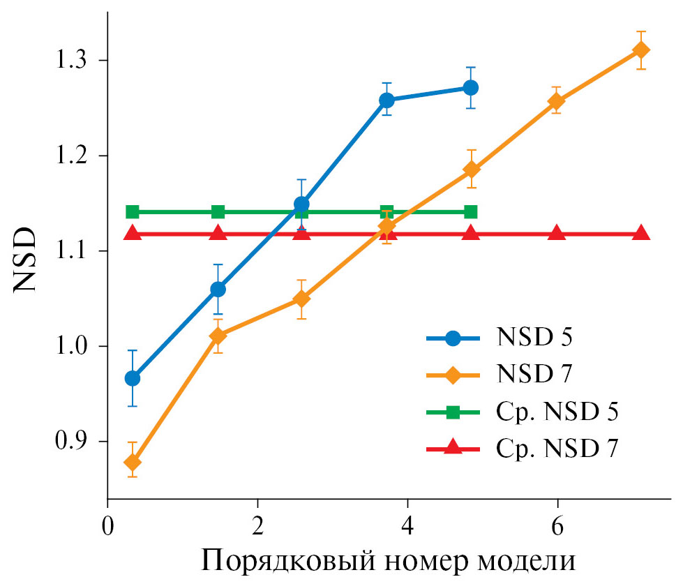 Рис. 2. Усредненные по расчетам отсортированные значения NSD для групп расчетов, состоящих из пяти и семи моделей, и их средние значения (горизонтальные линии).