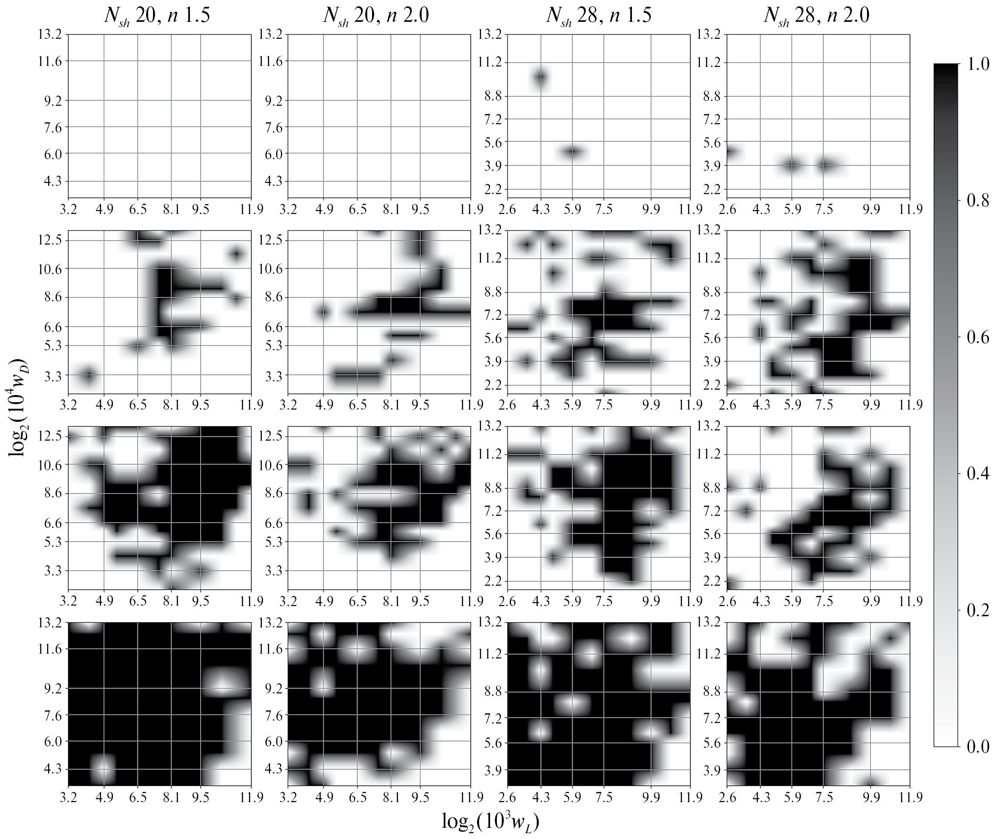 Из рис. 5 видно, что чем меньше шаг спирали, тем меньше области положительных расчетов (черный цвет). Для структуры I при Nsh = 20 отсутствуют положительные расчеты в рамках принятой обработки расчетов. Для этой же структуры при Nsh = 28 есть несколько обособленных областей положительных расчетов, которые, однако, могут являться результатом случайных выбросов в работе алгоритма.