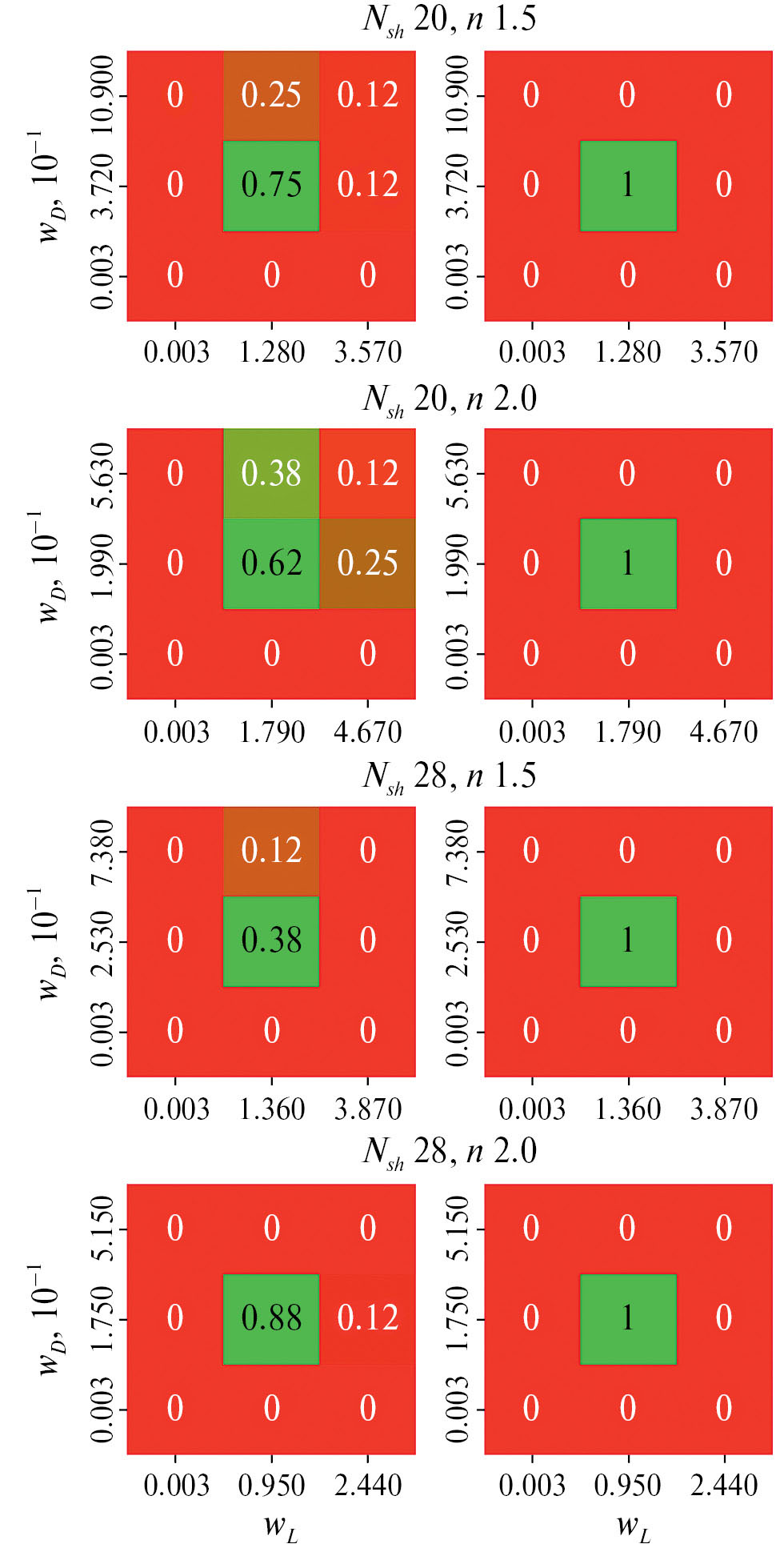 Рис. 8. Оптимальные значения весов штрафов за рыхлость (wL) и разрывность (wD) частицы в зависимости от разрешения пиков R на кривой p(r) для различных пар значений степени весовой функции (3) n и числа шенноновских каналов Nsh.
