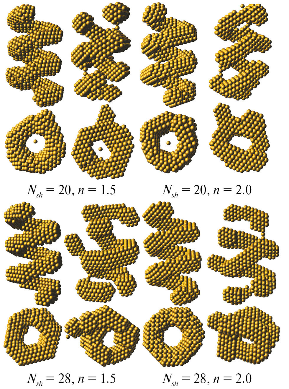 Рис. 1. Теоретические модели спиралей: сверху – вид сбоку, снизу – вид сверху. Шаг спирали (слева направо): 45, 50, 55 и 60 Å при диаметре 100 и 62 Å при диаметре 120 Å.