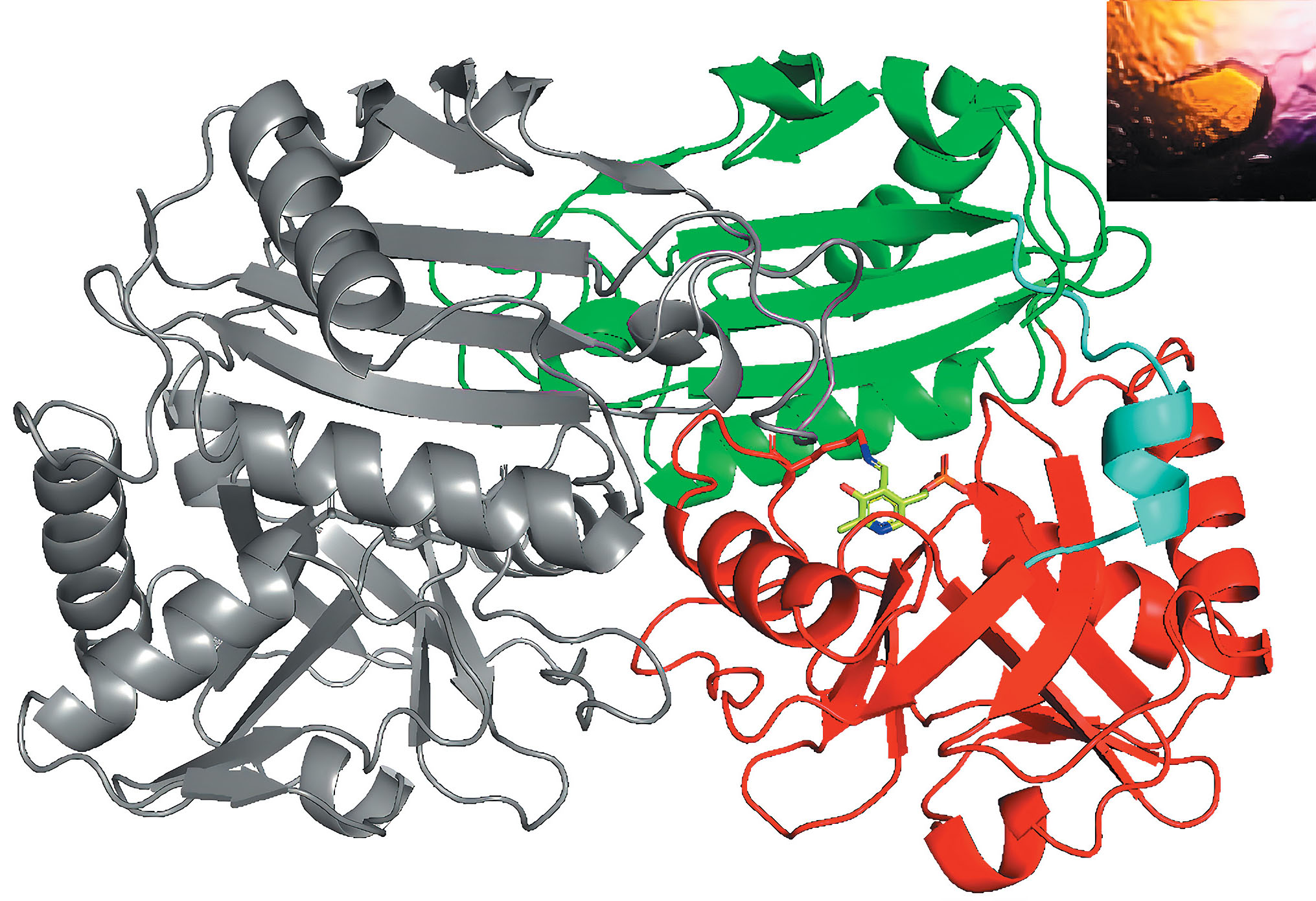 Рис. 1. Структура димера варианта VAPAN174K. N-концевой домен показан зеленым цветом, C-концевой домен – красным, междоменная петля – светло-зеленым, а соседняя субъединица – серым. Молекула PLP, ковалентно связанная с остатком K174, показана желтым цветом для одной из субъединиц. На врезке справа сверху приведена фотография кристалла варианта VAPAN174K, использованного в рентгеноструктурном эксперименте.