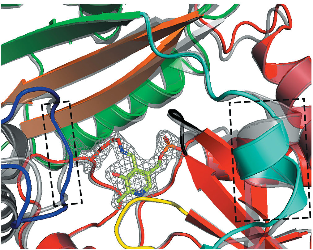 Рис. 2. Структурные различия варианта VAPAN174K (цветовая схема аналогична рис. 1) и VAPAwt (полупрозрачный серый, PDB ID: 7Z79) в предполагаемом активном центре. Электронная плотность (карта 2Fo–Fc) для внутреннего альдимина показана сетчатой поверхностью (уровень срезки 1σ), пунктиром обозначены участки, отличающиеся по конформации от таковых у VAPAwt. Дополнительные цветовые коды: синий – петля O-кармана, образованная остатками соседней субъединицы; оранжевый – βX- и βY-тяжи N-концевого домена; черный – β-поворот C-концевого домена; желтый – последовательность CNST, представляющая собой петлю с мотивом GAGE у других трансаминаз [1].