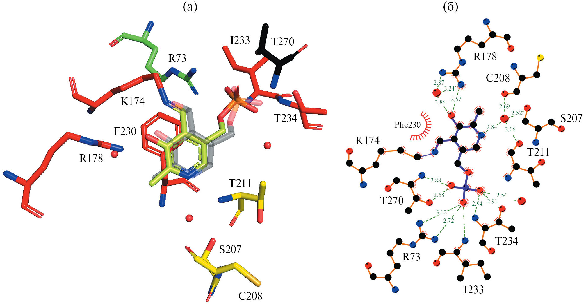 Рис. 3. Аминокислотные остатки, принимающие участие в связывании PLP в структуре варианта VAPAN174K: а – пространственное расположение остатков, цветовая схема аналогична рис. 2. Молекулы растворителя показаны красными сферами. Для сравнения серым полупрозрачным цветом показано положение молекулы PLP в структуре VAPAwt; б – схема связывания молекулы PLP, сделанная с помощью LigPlot [15]. Водородные связи показаны зеленой пунктирной линией с указанием соответствующих расстояний в ангстремах.