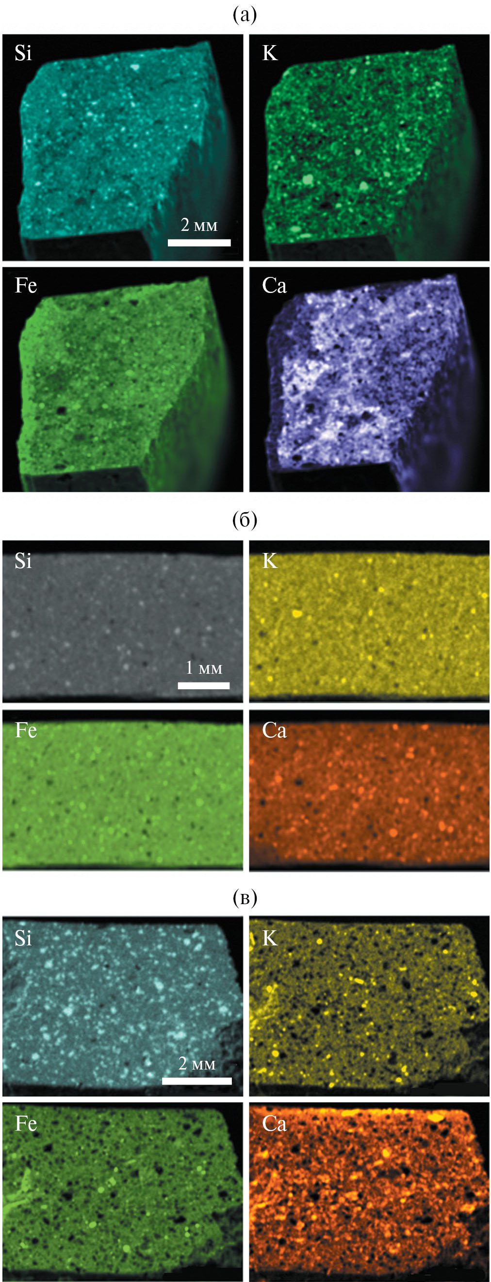 Рис. 3. РФлА-карты распределения элементов для образцов восточной (а), понтийской (б) и боспорской (в) сигиллаты.