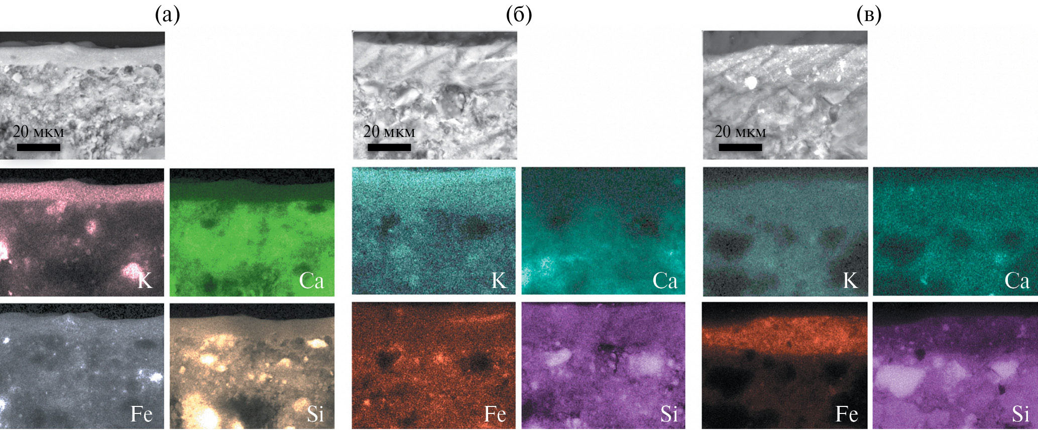 На рис. 6 представлено сравнение особенностей микроструктуры лакового слоя, демонстрирующее для восточной сигиллаты хорошо остеклованный слой с новообразованными кристаллитами, а для понтийской и боспорской групп – присутствие слоистых глинистых минералов, имеющих относительно низкую температуру деструкции слоистой структуры – 700–900°C (в некоторых случаях от 500°C).