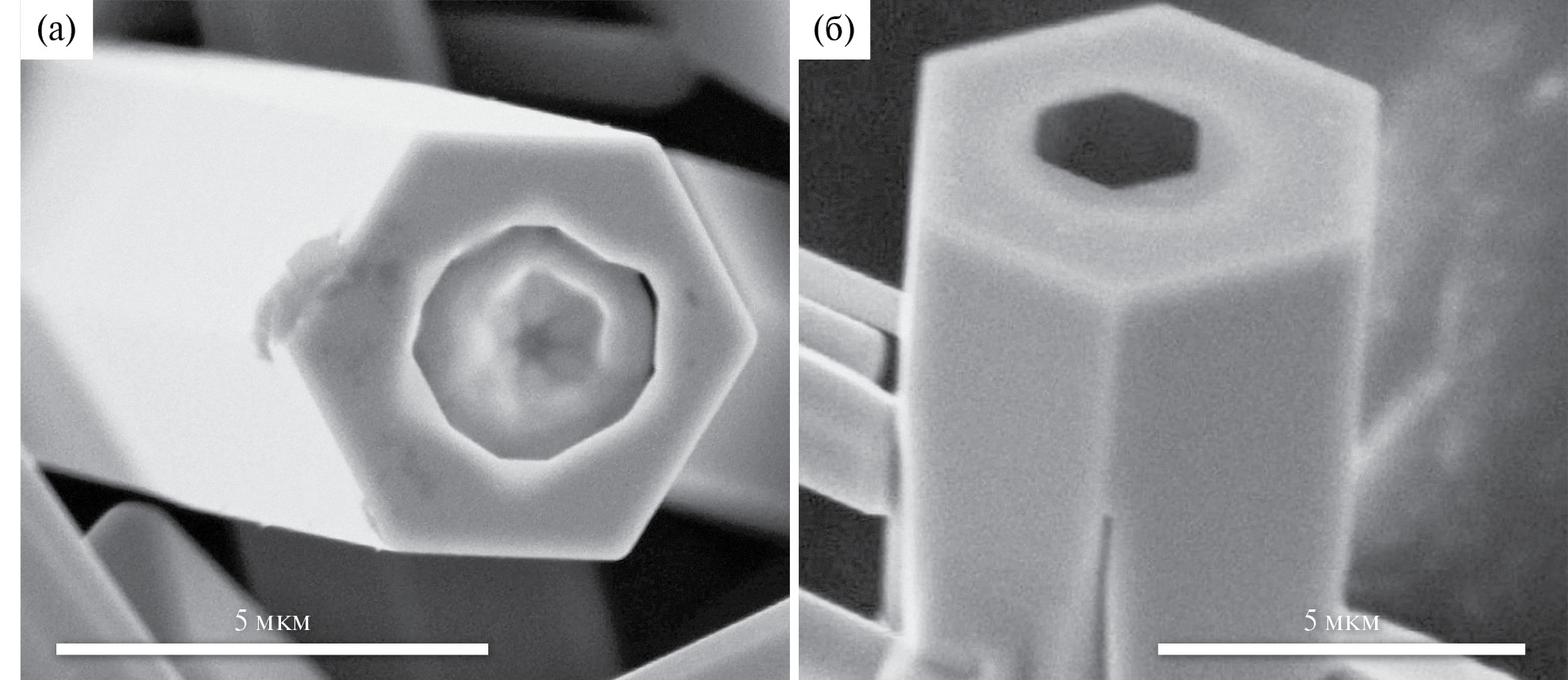 Рис. 2. РЭМ-изображения микростержней ZnO: а – начало процесса травления микростержня со стороны поверхности (0001), б – образование гексагональной ямки на торце микростержня.