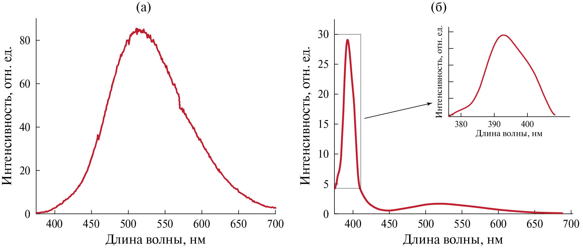 На рис. 3 приведены спектры ФЛ массива микротрубок, зарегистрированные при низкоинтенсивном квазинепрерывном возбуждении (a) и импульсном лазерном возбуждении с относительно низкой плотностью мощности ρexc ~ 6 кВт/см² (б). В полученных спектрах просматриваются несколько различий. В первую очередь наблюдается различное число полос излучения. Если в спектре на рис. 3б наблюдаются две полосы излучения – в ближней УФ и видимой частях спектра, то в спектре на рис. 3a присутствует только полоса видимой люминесценции. При этом параметры полосы видимой люминесценции – положение (λm) и ширина на половине высоты (FWHM) – оказываются примерно одинаковыми: в случае непрерывного возбуждения λm и FWHM составляют 516 и 117 нм соответственно; при импульсном возбуждении эти параметры равны 518 и 119 нм. Положение λm и полуширина FWHM полосы УФ-излучения в спектре на рис. 3б равны 393 и 17 нм соответственно. Эта полоса известна как близкраевое излучение ZnO. При этом в исследованном случае УФ-полоса явно сама состоит из нескольких компонент: около основного максимума наблюдается коротковолновое плечо в области ~380 нм (вставка на рис. 3б).