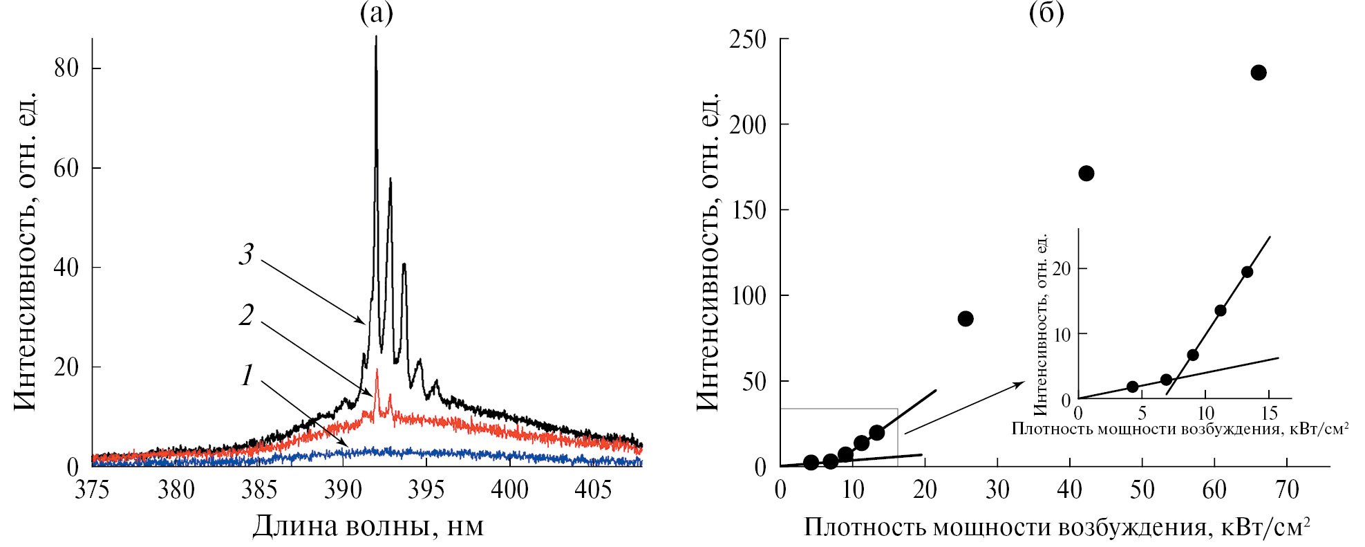 Рис. 4. Спектры близкраевого излучения микротрубки ZnO при различных плотностях мощности возбуждения ρexc: 1 – 7, 2 – 13, 3 – 26 кВт/см2 (а); зависимость интенсивности от ρexc в области наиболее интенсивной лазерной линии с длиной волны ~392.05 нм (б).