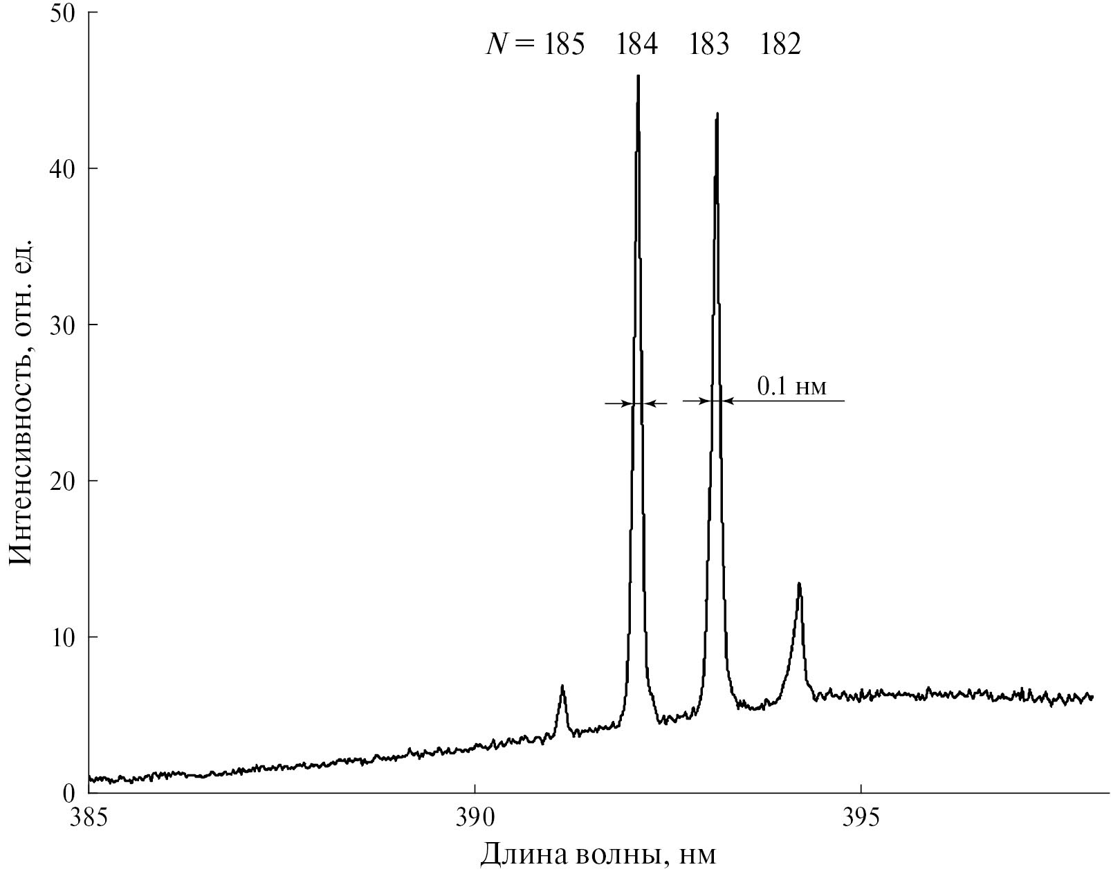 В целом исследуемая микроструктура демонстрирует не только низкие лазерные пороги, но и высокие оптические добротности. Так, на рис. 5 приведен спектр лазерной генерации одного из микрокристаллов при ρexc ~ 0.1 МВт/см². Учитывая спектральное положение (392–393 нм) и FWHM (0.1 нм) отдельных лазерных линий, получаем добротность более 3900. Это значение оказывается сравнимо и даже часто выше, чем в случае других высококачественных микрокристаллических лазеров с МШГ на основе ZnO [10, 11, 14, 19, 35].