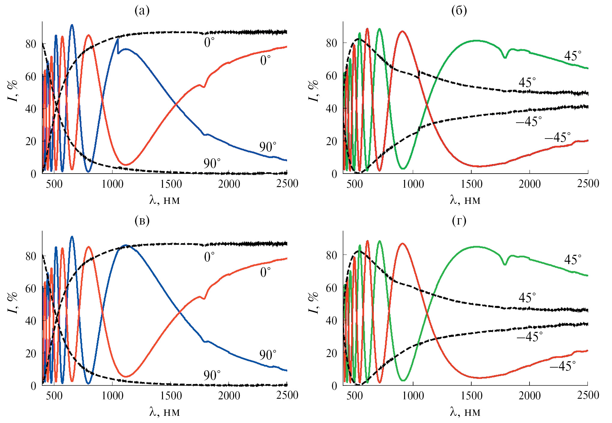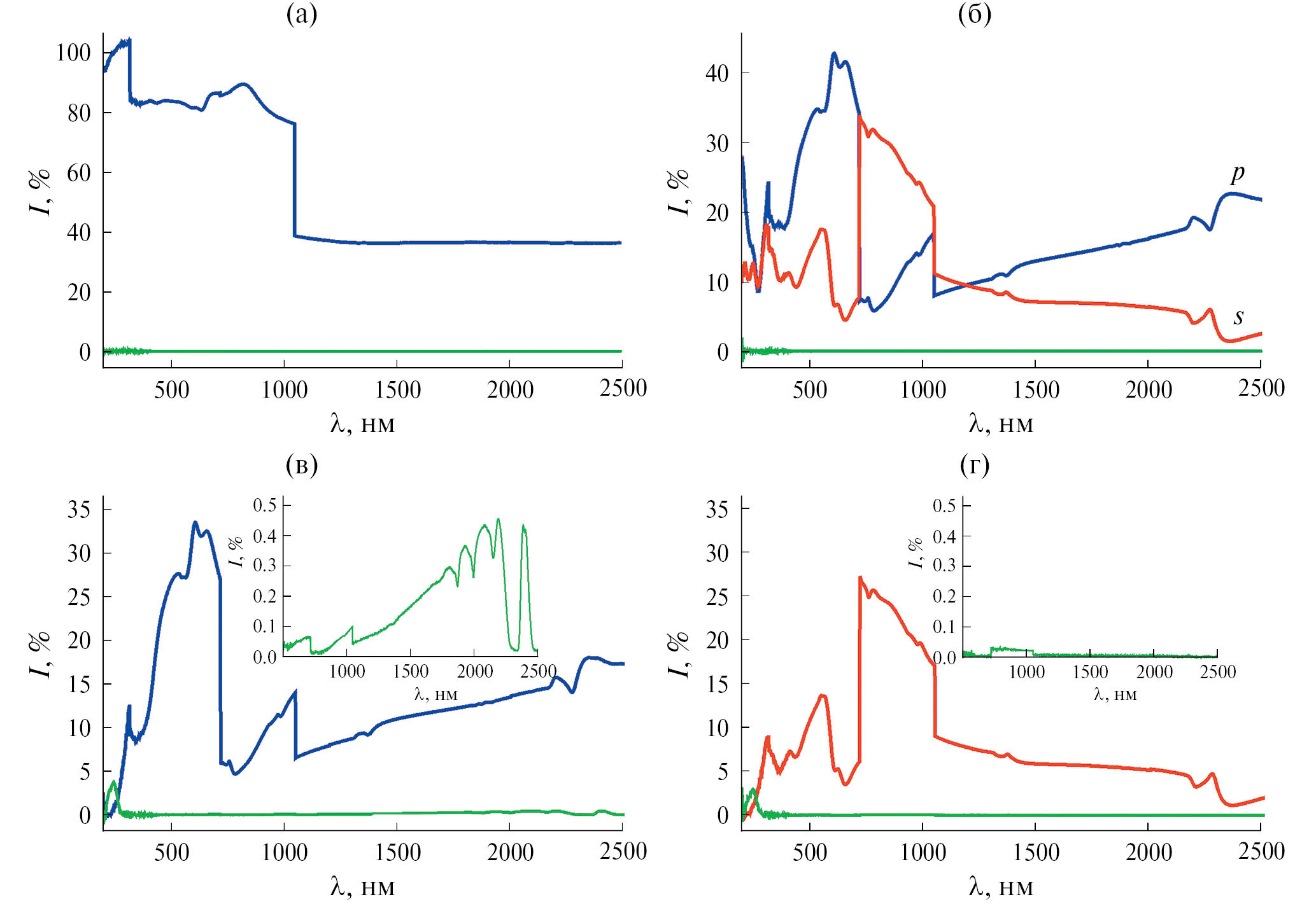 Базовые линии для трех рассмотренных случаев приведены на рис. 1. Базовая линия, соответствующая 100%-ному пропусканию без поляризатора (рис. 1а), имеет заметный скачок при 1050 нм, связанный, вероятно, со сменой канала в детекторе прибора (переход с Si на InGaAs в соответствии со штатными настройками спектрофотометра Cary-5000 c приставкой UMA [9]). Также имеет место незначительная “ступенька” при λ = 720 нм (при этой длине волны происходит “смена решетки” [9]). Исходя из вида базовых линий с поляризатором (рис. 1б) можно предположить, что поляризация падающего света меняется скачком при длинах волн λ = 720 и 1050 нм, так как при этих длинах волн на кривых имеются разрывы. При измерениях с поляризатором и анализатором важна точность нулевой базовой линии, т.е. отличие пропускания скрещенных поляризаторов от нуля должно быть минимальным (рис. 1в, 1г). В УФ-области при λ = 200–300 нм измерения с данными поляризаторами невозможны (пропускание скрещенных поляризаторов становится больше, чем их пропускание в параллельном положении). Если положение параллельных поляризаторов соответствует p-поляризации, пропускание поляризаторов в видимой области больше (рис. 1в), поэтому для измерений в видимой области лучше использовать именно это положение. В ИК-области, наоборот, лучше проводить измерения при s-поляризации, так как пропускание скрещенных поляризаторов заметно меньше, чем при p-поляризации (вставки на рис. 1в, 1г).