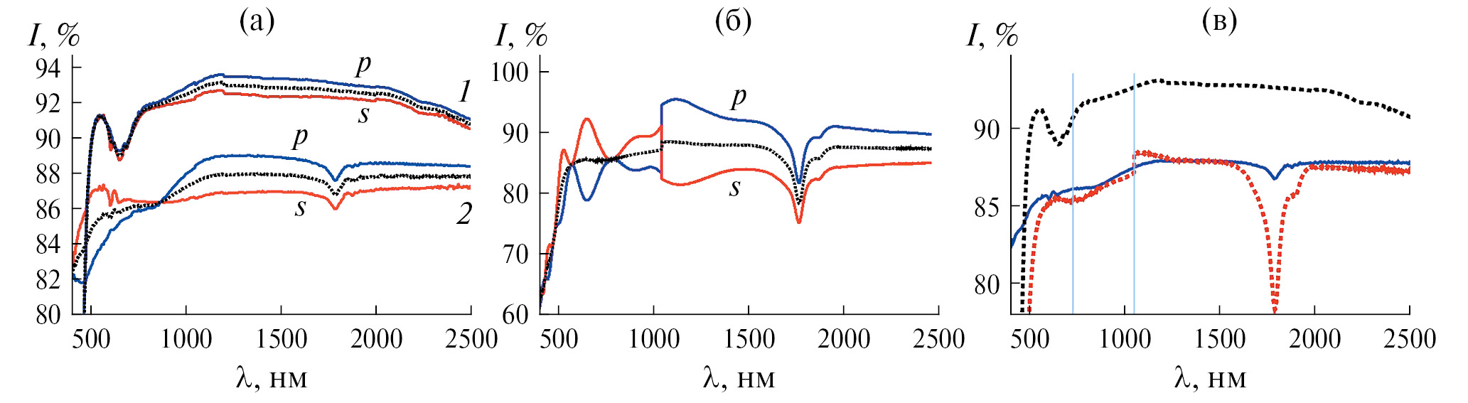 Неидеальность поляризатора можно оценить по пропусканию скрещенных поляризаторов (отношение пропускания скрещенных и параллельных поляризаторов ~ 2p2/p1). Из рис. 1в, 1г видно, что величина p2 значительна в диапазоне λ = 200–300 нм. Также p2 ≠ 0 в ИК-области при p-поляризации (рис. 1в), но в этом случае отношение p2/p1 не превышает 0.015.