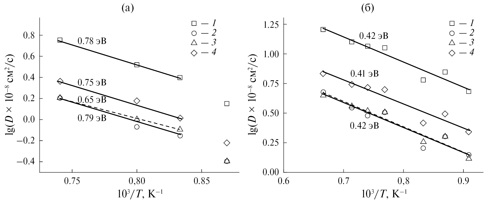 Рис. 1. Температурные зависимости коэффициентов диффузии кислорода DO в кристаллах, содержащих 15 кислородных вакансий (а) и 10 междоузельных ионов кислорода (б): общий коэффициент диффузии (1), DO вдоль осей a (2), b (3) и c (4) соответственно. Цифры у прямых – энергии активации диффузии.
