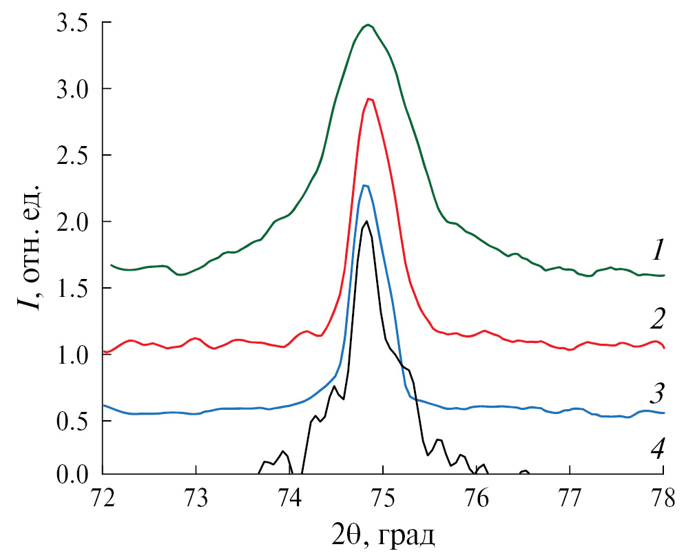 Рис. 2. Распределение интенсивности в профиле отражения 220 для образцов после: 1 – оребрения, 2 – оребрения и отжига, 3 – отжига без оребрения; 4 – результат решения уравнения Фредгольма, соответствующего размытию дифракционных максимумов, только из-за неоднородных деформаций и размера зерна.
