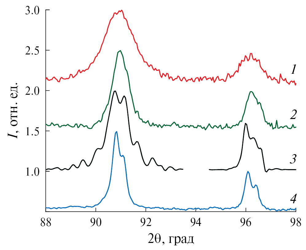 Рис. 3. Распределение интенсивности в профиле отражения 311 и 222 для образцов: 1 – после оребрения методом ДР-1, 2 – отжига с обработанной поверхностью методом ДР-1, 4 – образца с плоской поверхностью; 3 – результат решения уравнения Фредгольма, соответствующего размытию дифракционных максимумов только из-за неоднородных деформаций ДР-1.