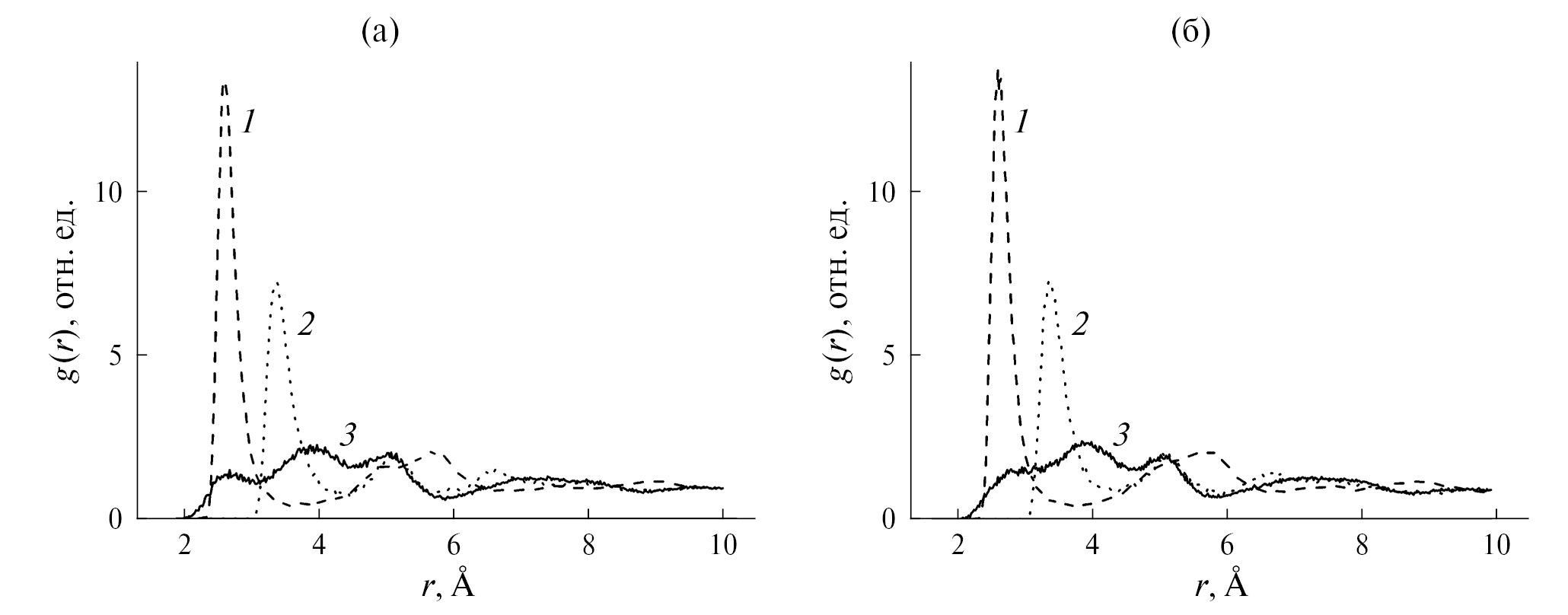 Рис. 4. РПКФ пар Ag–I (1), I–I (2) и Ag–Ag (3) в трубках с линейными (а) и планарными (б) нанокластерами при 900 К.