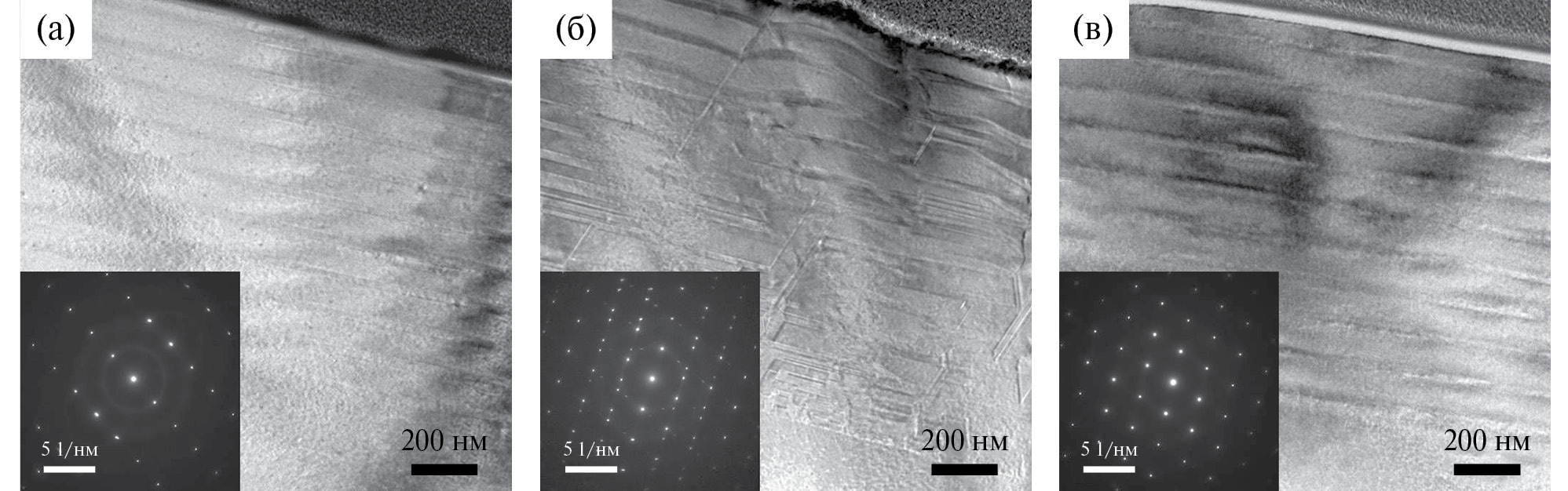 Рис. 2. Светлопольные ПЭМ-изображения образцов: а – 105 (100), б – 103 (110), 104 (111)А. На вставках – соответствующие электронограммы.