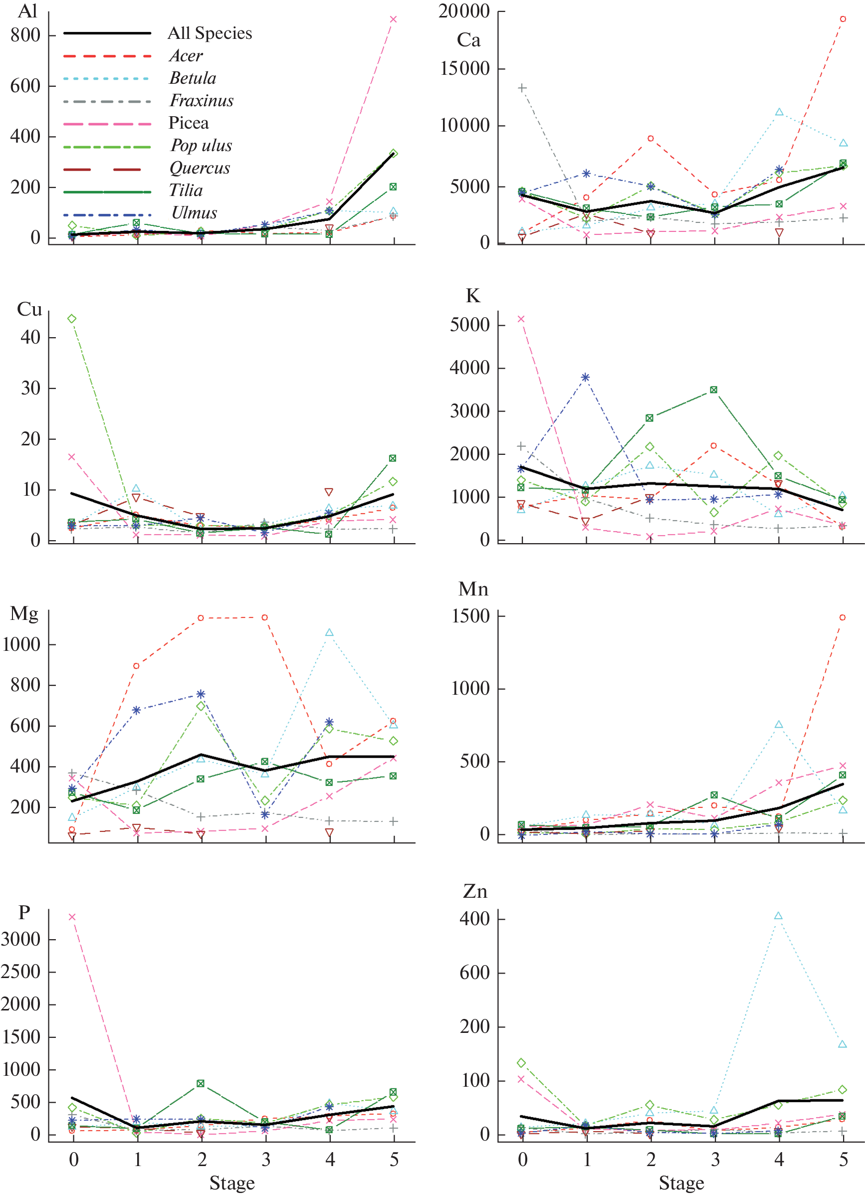 The content and mass concentration of eight chemical elements Al, Ca, Cu, K, Mg, Mn, P, and Zn were analysed in dead wood of eight tree species at five stages of decomposition. Wood samples were taken at the site of the mass windfall of 2006 in a multispecies broadleaved forest in the Kaluzhskie Zaseki nature reserve. Deadwood of seven deciduous trees species was studied: maple (Acer platanoides), birch (Betula pendula), common ash (Fraxinus excelsior), common aspen (Populus tremula), English oak (Quercus robur), linden (Tilia cordata), rough elm (Ulmus glabra), as well as one coniferous tree species – Norway spruce (Picea abies). A series of one-way analyses of variance was carried out to assess the influence of the species and the stage of deadwood decomposition (including the zero stage for control samples) on the density, content of elements and their mass concentration. Tree species most clearly differed in the content and mass concentration of Mn, Zn, Mg, Ca, and K: R2 varied from 50 to 23% for the content and from 53 to 19% for the mass concentration of elements of the indicated series. The leaders in the content of these elements were the following species: Mn – maple, birch, spruce, linden; Zn – birch and aspen; Mg – maple, elm; Ca – elm; K – linden, elm. The stages of wood decomposition turned out to be a significant factor of variation for the content of Mn, P, Cu, Zn and Ca: R2 varied from 22 to 16%. During the destruction of wood trunks, a significant increase in the content of these elements occurred. Maintenance of cycles of biophilic elements is more successfully implemented in the presence of deadwood of different species at different stages of decomposition.