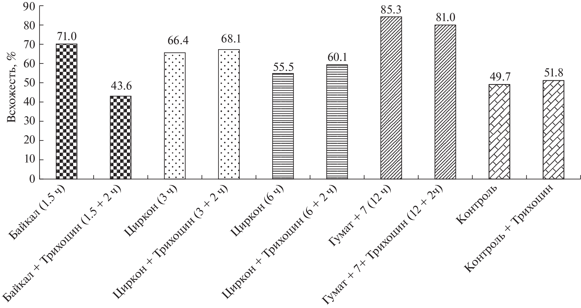 For the cultivation of planting stock of forest-forming species, the measure most often used currently is the pre-sowing treatment of seeds with stimulants, which positively affects the germination of seeds and the growth of seedlings, and for each region of the country the choice of growth substances is different. The aim of the research was to identify the optimal stimulant and soaking time during the pre–sowing treatment of Scots pine seeds (Pinus sylvestris L.). The objects of research were one- and two-year-old seedlings, growing in the forest nursery of the Shaldai branch of the State Forest Natural Reserve (SFNR) “Ertis Ormany” in the Pavlodar region. Three stimulants (Baikal, Zircon, Humate-7 trace substances) and the fungicide Trichocine were tested. The field germination of seeds, the number of plants per unit area and the height of seedlings were all studied. In the experiment with a combined usage of the stimulants and the Trichocine, the average height of pine yearlings was lower than that of control seedlings. But at the age of two years, the average height of seedlings in the two experiments exceeded the height of control seedlings by 20.8 and 1.4%. Thus, the prolonged effect of pre-sowing seed treatment with the stimulants and the Trichocine on enhancing the growth and number of preserved seedlings per unit area at the age of two years has been proven. The data obtained from cluster and rank analyses showed that for the pre-sowing treatment of Scots pine seeds in the conditions of ribbon forests of the Irtysh region, the most optimal way was to soak the seeds in the Humate + 7 micronutrients for 12 hours together with the Trichocine (12 + 2 hours) in a concentration of 1.5 g of the stimulant and 0.6 g of the fungicide per 1 liter of water.