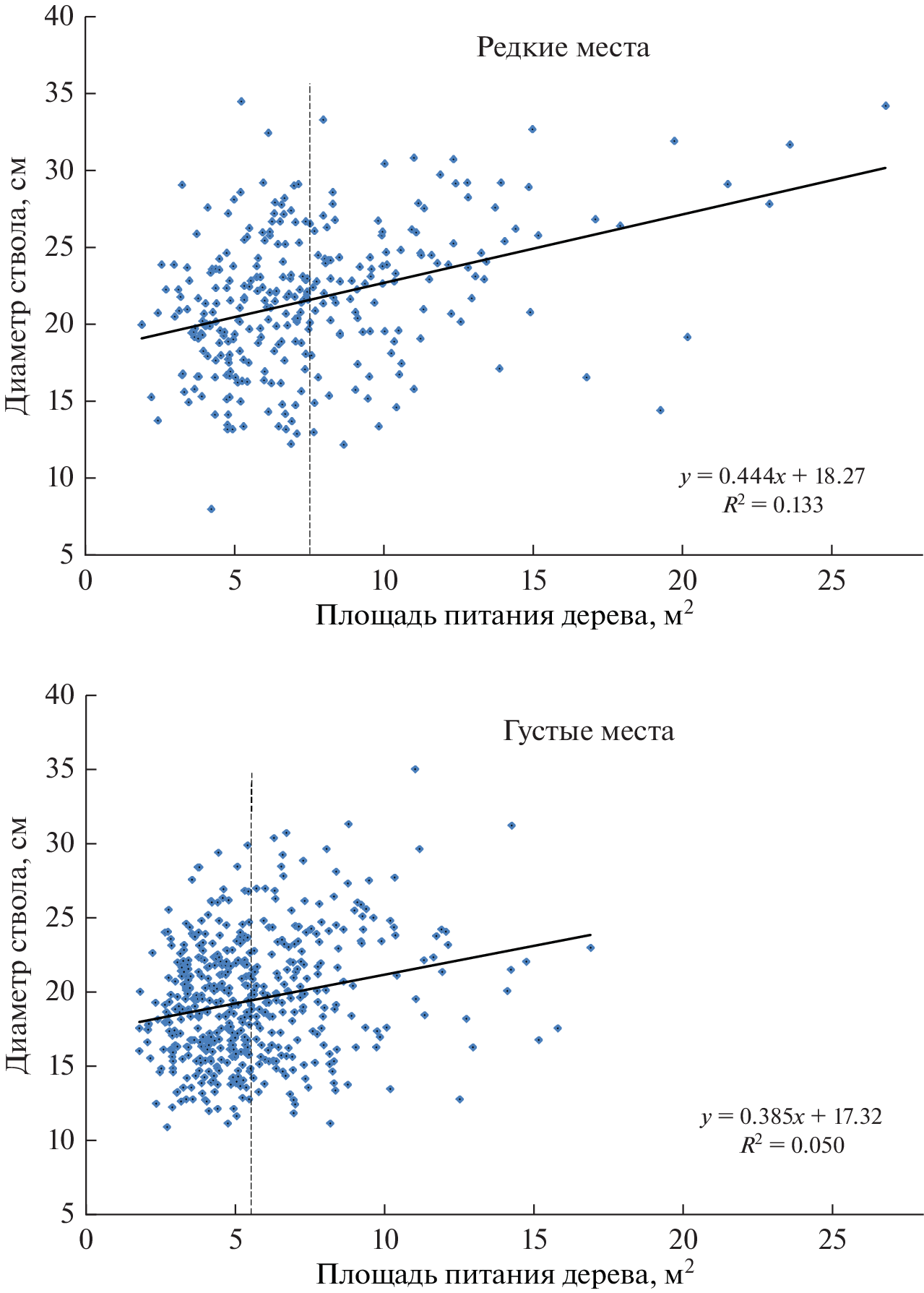 Pine plantations of class 1B were studied, with a density of 0,95 on an area of 0,64 ha, created in a cleared area following the 1.82 × 1.10 m plan. Alive and dead trees and their feeding areas were plotted on the plan in the ArcMap-ArcView programme. The territory was divided into 9 sections, with a density of 76–122% of the average for the plantation. The feeding area the trees had at the age of 30 years affected the trunk diameter at 55 years in sparse areas of the stand on average by 13.3%, and in denser areas by 5.0%. That confirmed the hypothesis that the influence of the tree feeding area on the trunk diameter can also be weak in the middle-aged stands, and the magnitude of its influence depends on the density of the stand. Tree mortality by the age of 55 correlated with the frequency in feeding area classes (r = 0.96 ± 0.03), thus the feeding area being less than the average value increased the probability of a tree falling off by the age of 55 by only 7%. It has been suggested that the decrease in the affect the feeding area has at high density is due to the increased cooperation of trees. With simulated thinning of the stands, with an increase in the feeding area of the remaining trees by 2 times, a corresponding increase in diameter was obtained only in 11% of the trees. The remaining 89% of the trees did not take advantage of the larger feeding area and did not increase in size, despite 25 years of development with a sparser standing. This indicates that in plantations of the second age class, an increase in the feeding area no longer leads to an improvement in their development in the vast majority of cases. Therefore, the density should be reduced at a much earlier age, for example, at 10–15 years.